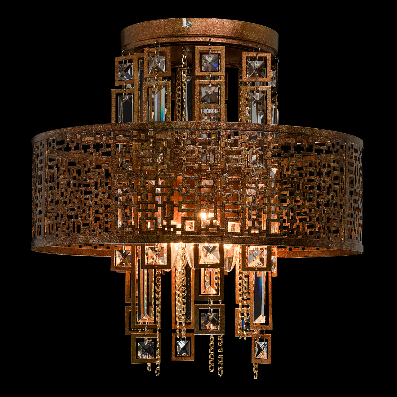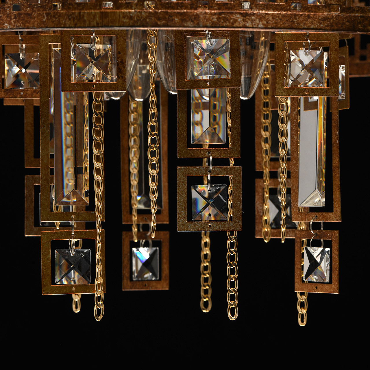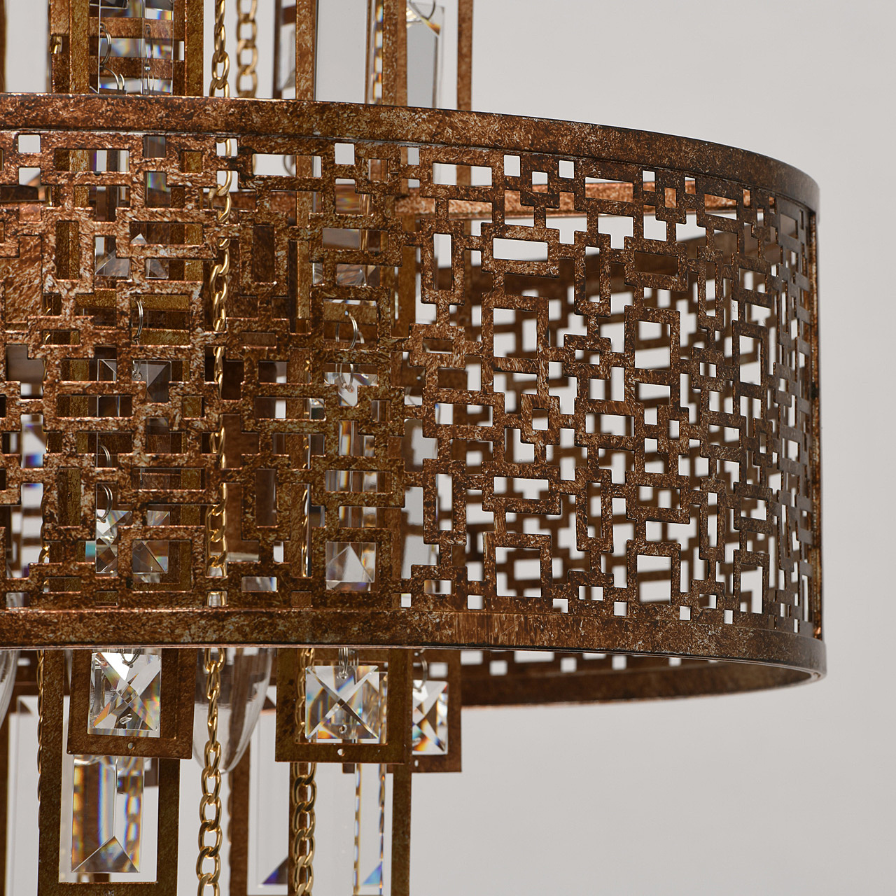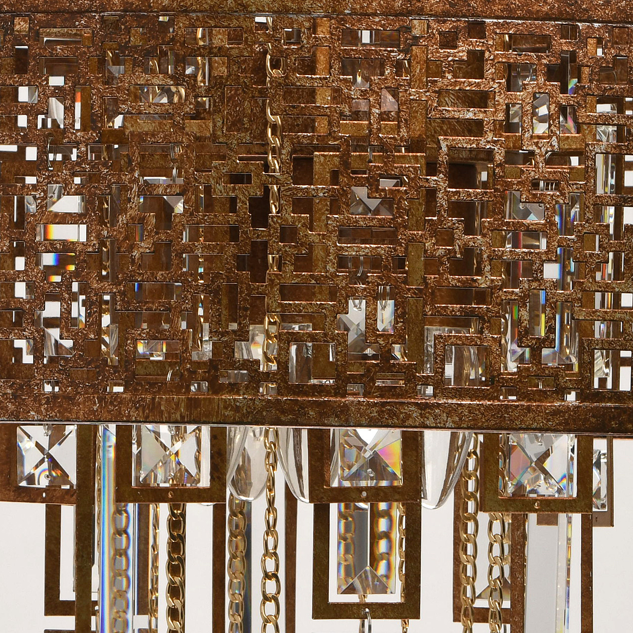 Традиционный узор Марокко выполнен в цвете коньячного дуба с эффектом благородной ржавчины. Ориентальная тональность коллекции станет находкой для ценителей этно, арт-деко, обладающих помещениями Loft и лаунж. Ручная технология окрашивания и крупный хрусталь при свете каждый раз будет преображаться по-разному, что добавляет исключительной привлекательности владельцу. Возможности крепления позволяют регулировать высоту подвеса к потолку. Сильные источники света сконцентрированы в центре светильника, широко отдавая рассеянный свет вовне. Семья дополнена потолочным светом в том же стиле.