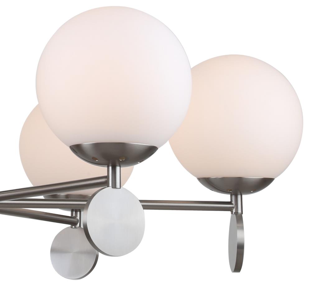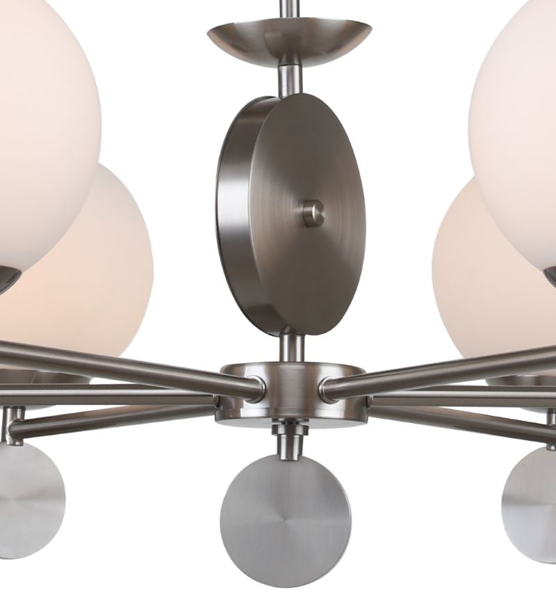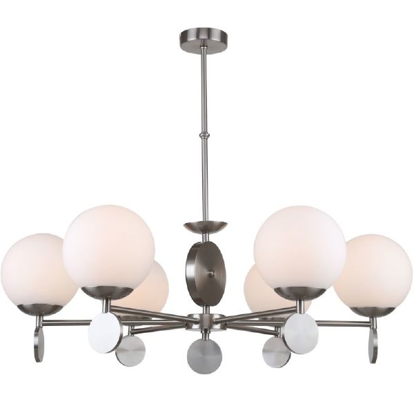 Люстра на штанге из коллекции Marsela выполнена из металла, гальванизированного в цвет никеля, и декорирована белыми стеклянными матовыми плафонами, а также металлическими медальонами, гальванизированными в цвет арматуры. Премиальное качество и неповторимыи? дизаи?н светильников идеально подои?дут в современные и дизайнерские интерьеры.