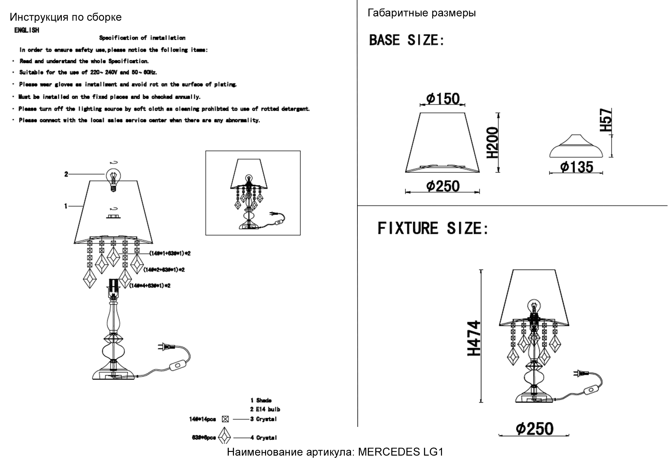 Допускается отличие страны-изготовителя, указанной в характеристиках. Линии производства могут находиться в нескольких государствах. Это не влияет на качество изготовления товара: все заводы данного бренда работают по общим стандартам, а готовые изделия проходят соответствующий контроль.Испания Коллекция Mercedes ЦветЦвет арматуры Хром Цвет Хром Материал арматуры Металл Цвет декора дымчатый Цвет плафона Белый Материал декора Хрусталь Материал плафона Текстиль, Пластик РазмерыВысота (мм) 480 Диаметр (мм) 250 Высота минимальная (мм) 480 Ширина (мм) 250 ЭлектрикаКоличество ламп (шт) 1 Цоколь E14 Мощность лампы (Вт) 60 Напряжение (В) 220 Дополнительная информацияСтепень защиты (IP) 20 Тип выключателя Выключатель на шнуре -