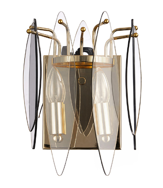 Светильник настенный из коллекции Merkel выполнен из металла, гальванизированного в цвет золота, и декорирован полупрозрачным стеклом в форме линзы дымчатого цвета.