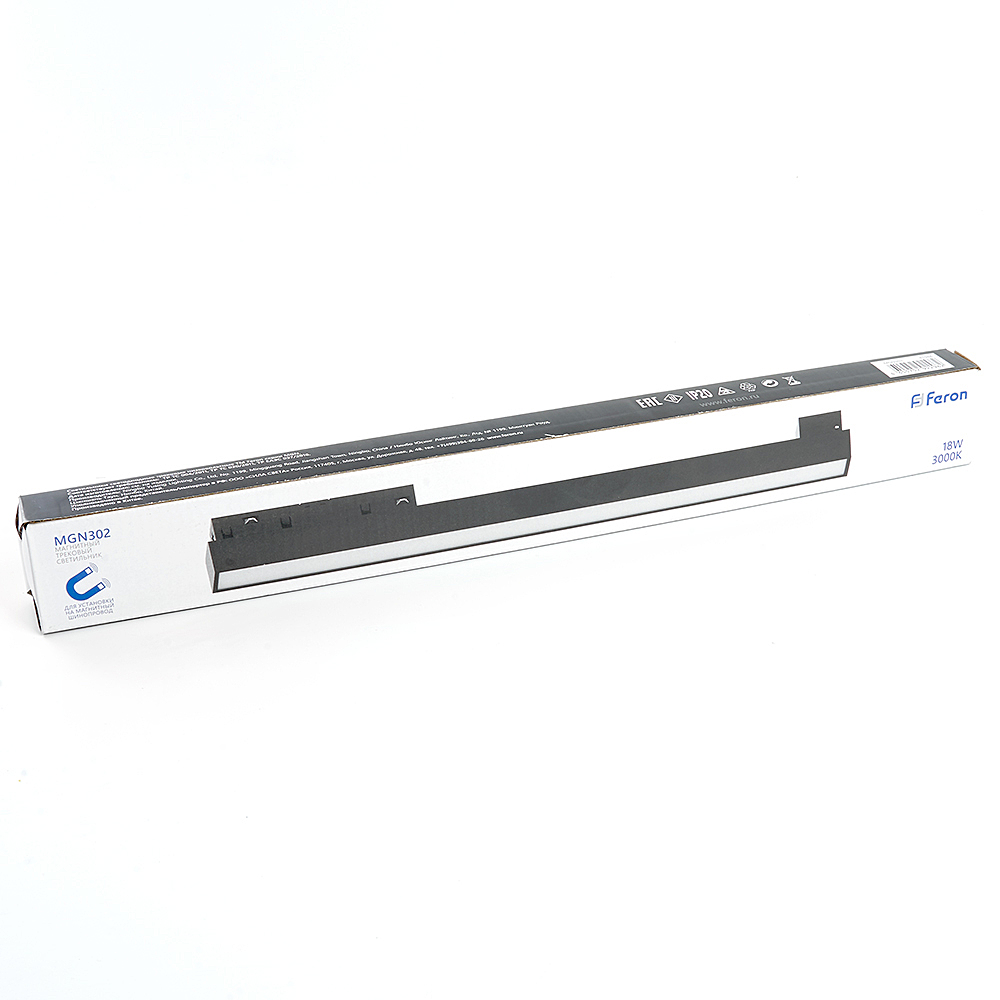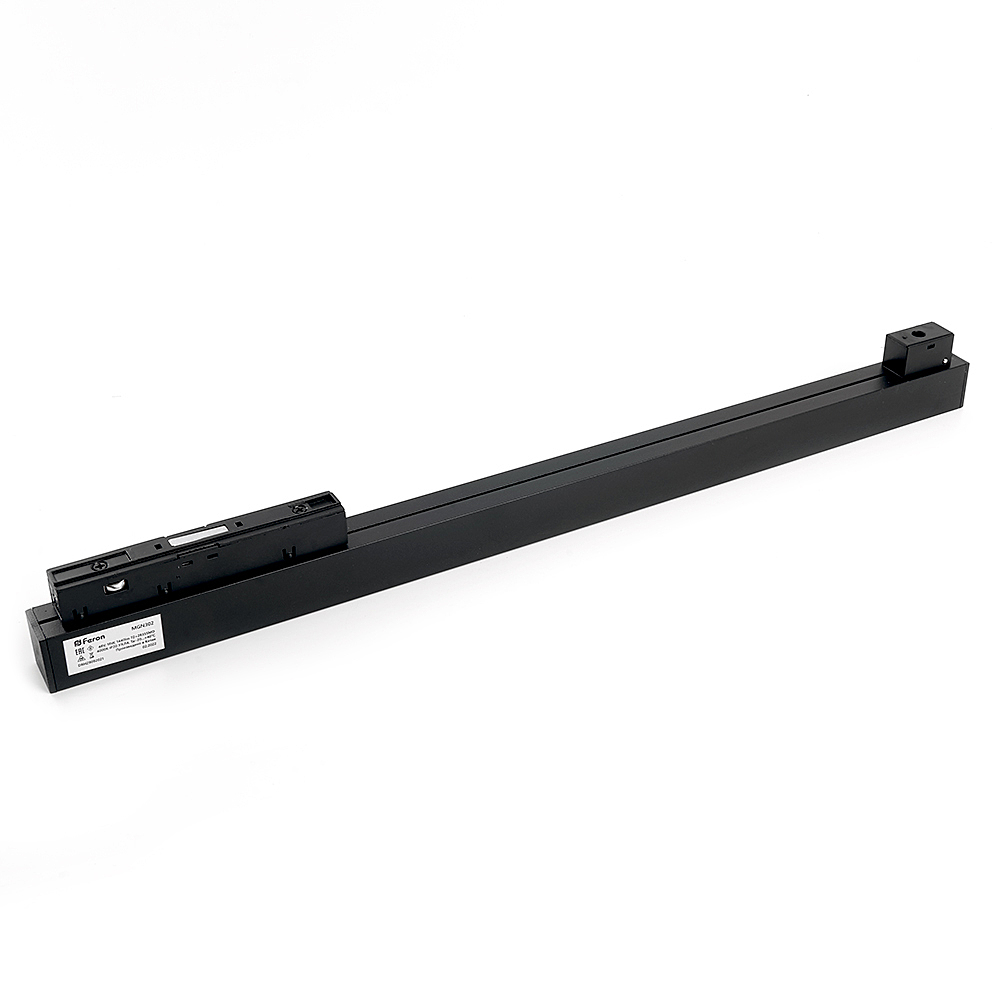 Светильник трековый на шинопровод, - (ДПО) FERON MGN302, 18W, 3000К (белый теплый), 48V, 1440Lm, цвет черный, корпус алюминий, рассеиватель поликарбонат, 450*22*43 мм