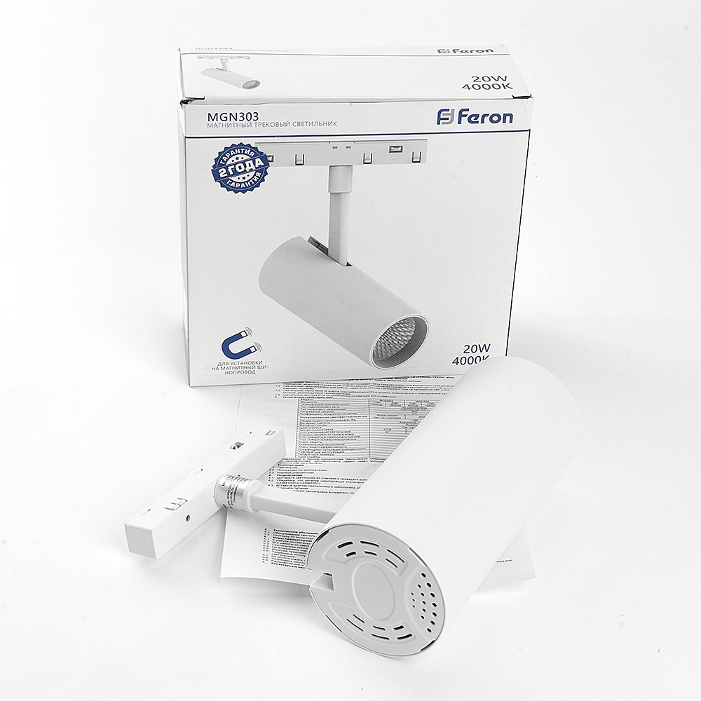 Светильник Трековый На Шинопровод, - (Дпо) Feron Mgn303, 20W, 4000К (Белый), 48V, 1800Lm, Цвет Белый, Корпус Алюминий, Рассеиватель Поликарбонат, Вращение ?350градусов/?90градусов, 168*160*70 Мм