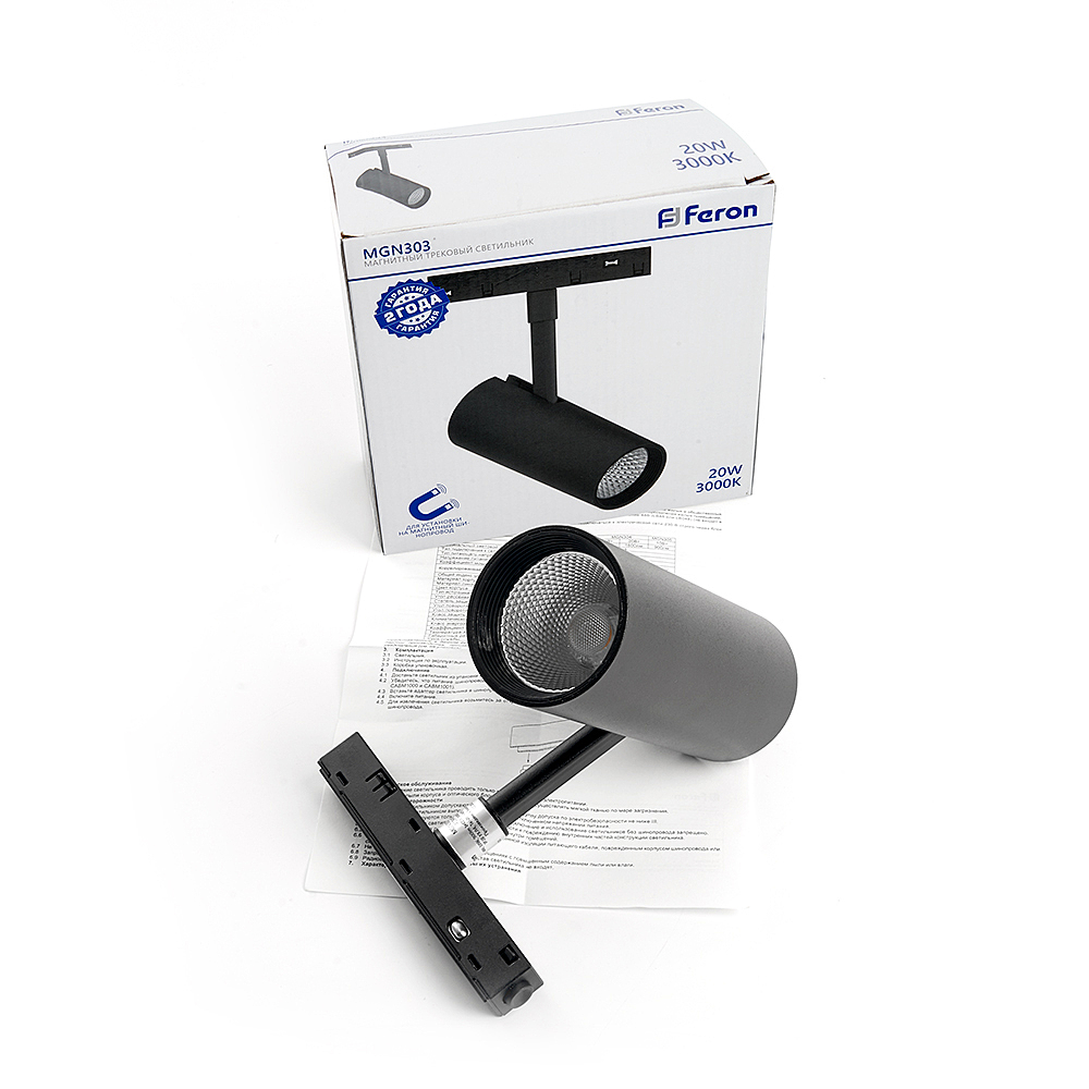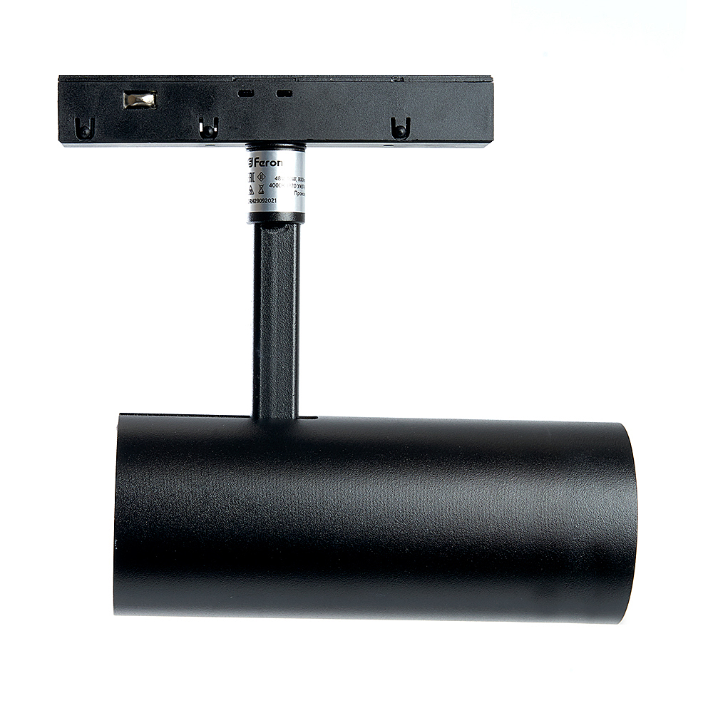 Светильник трековый на шинопровод, - (ДПО) FERON MGN303, 20W, 3000К (белый теплый), 48V, 1800Lm, цвет черный, корпус алюминий, рассеиватель поликарбонат, вращение ?350градусов/?90градусов, 168*160*70 мм