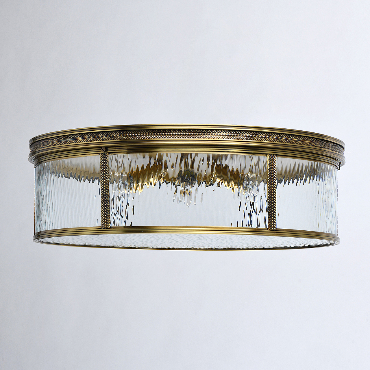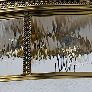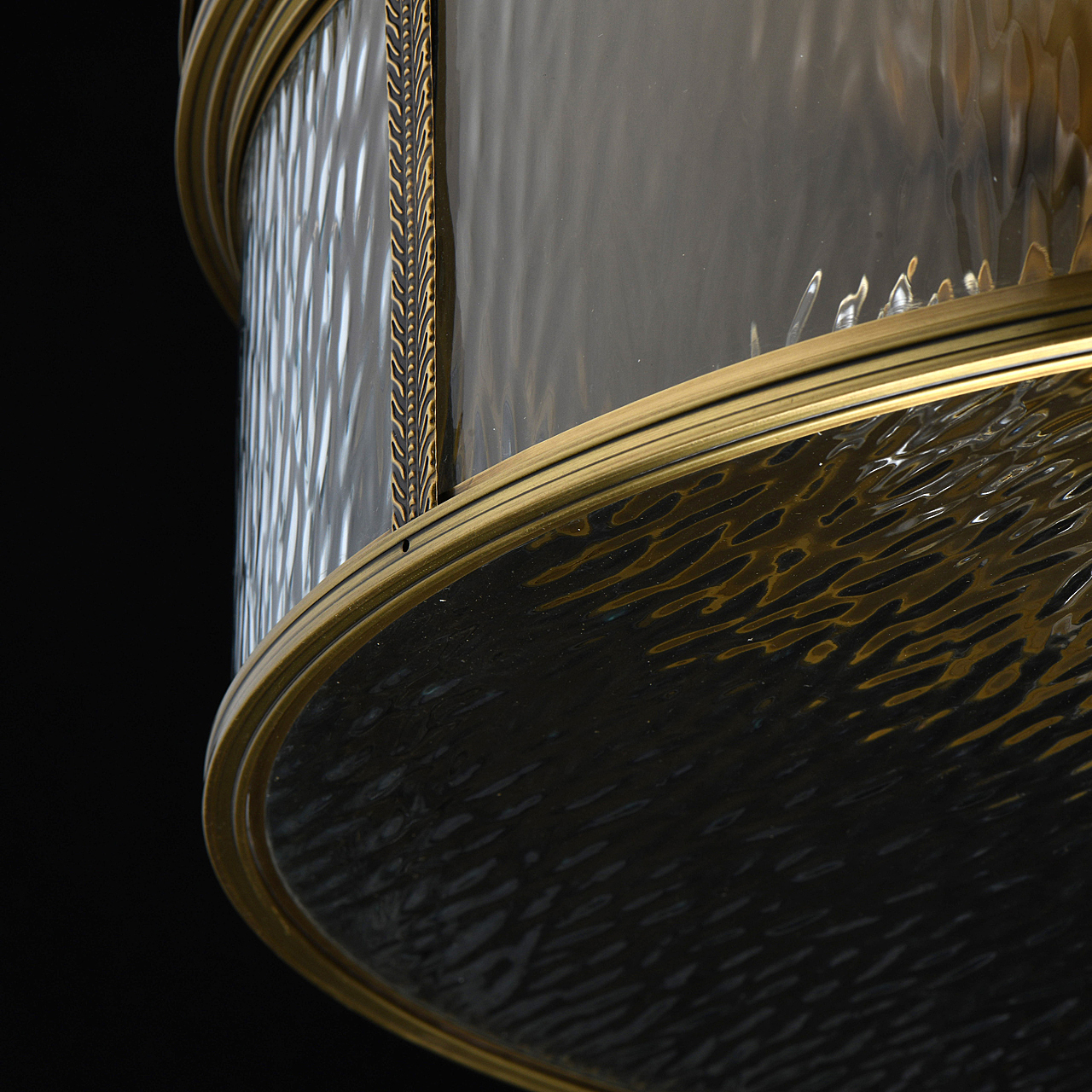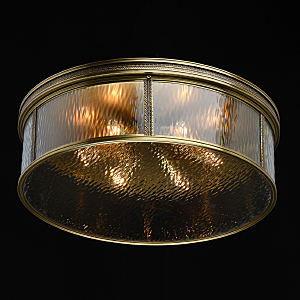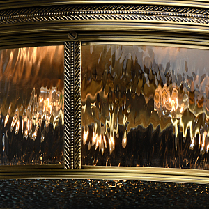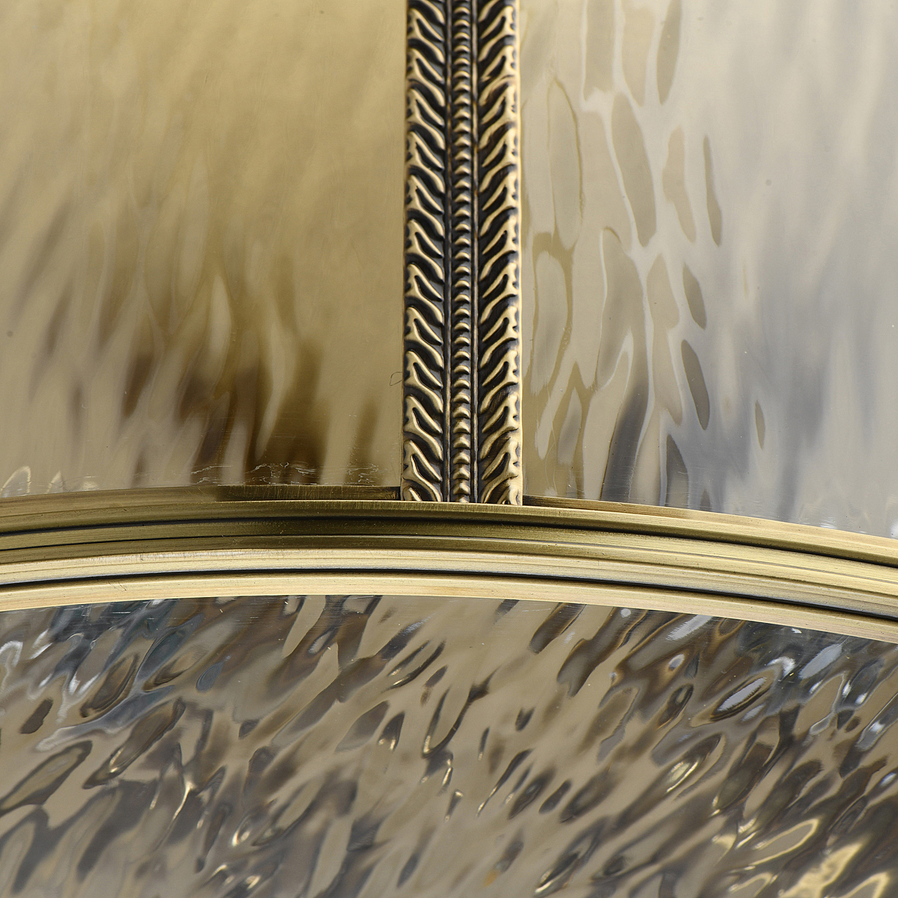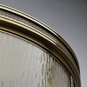 Основание из благородной латуни украшено художественной чеканкой . Фактурное стекло с эффектом дождевых струй полностью герметично.Компактные размеры по высоте идеальны для стандартных потолков.Большой диаметр светильника обеспечивает высокие параметры освещенности.Система отвода конденсата гарантирует долгий срок службы источников света.IP 44 защита от влажности и пылиПолная семья для комплексного освещения интерьеров и ландшафтных зон.