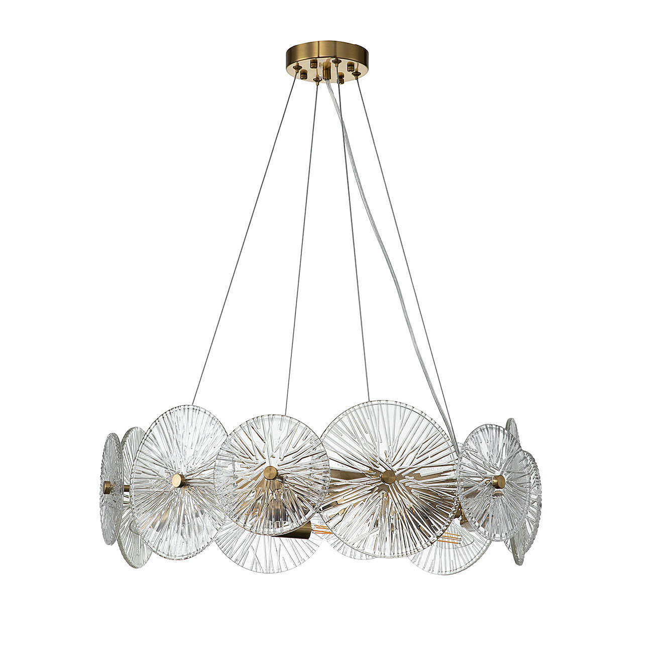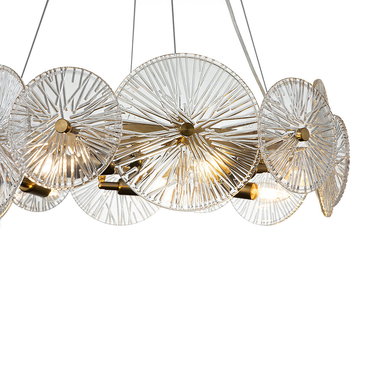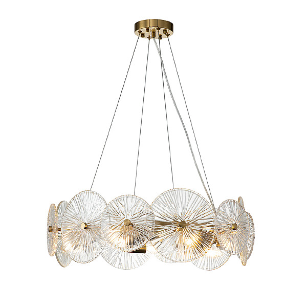 Серия светильников Miele будто отражение яркого солнечного дня, полного радости и счастья. Необычные прозрачные лучистые медальоны на каркасе из цвета латунь придают утонченности и изысканности всему светильнику. Они точно маленькие золотистые солнышки, освещающие все вокруг теплым манящим светом. Размер 600*600*225/1225 МощностьE14 60W х 7 Цвет ЛАТУНЬ/ПРОЗРАЧНЫЙ С УЗОРОМ Материал МЕТАЛЛ/СТЕКЛО