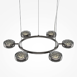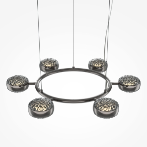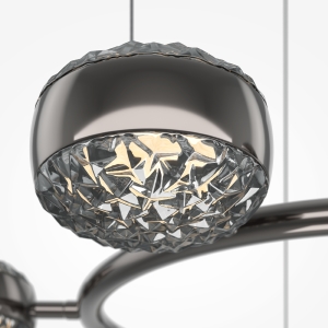 Два цветовых сочетания: сатинированная арматура из металла в цвете латунь в комбинации со стеклянными плафонами янтарного оттенка или трендовый черный хром с глянцевым финишем в сочетании с тонированными светло-серыми плафонами. Источник света: LED. Цветовая температура 3000К, угол рассеивания 120 градусов. Провод длиной 3 м можно регулировать по высоте- светильник подходит для помещений с высокими потолками.