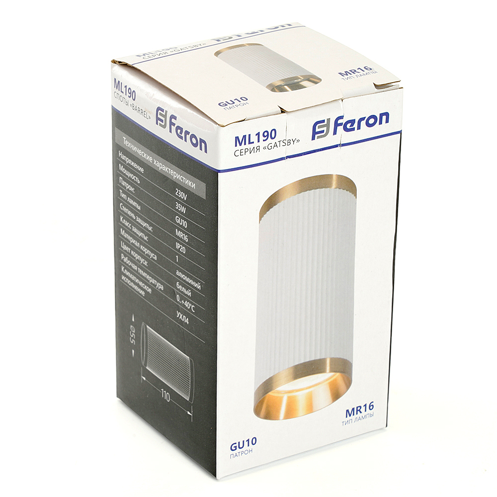 Светильник накладной под лампу, спот (-) FERON ML190, GU10 35W, 230V, IP20, цвет белый, корпус алюминий, 55*55*110
