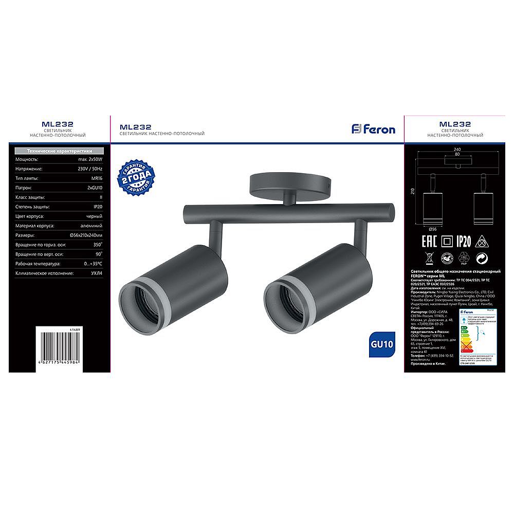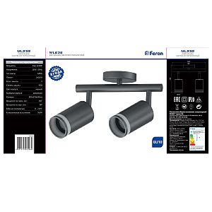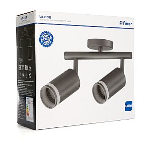 Светильник накладной под лампу, поворотный (ИВО) FERON ML232, 2*GU10 2*50W, 230V, IP20, цвет черный, корпус алюминий, 240*56*210
