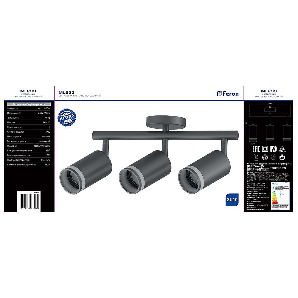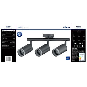 Светильник накладной под лампу, поворотный (ИВО) FERON ML233, GU10 3*50W, 230V, IP20, цвет черный, корпус алюминий, 300*56*210