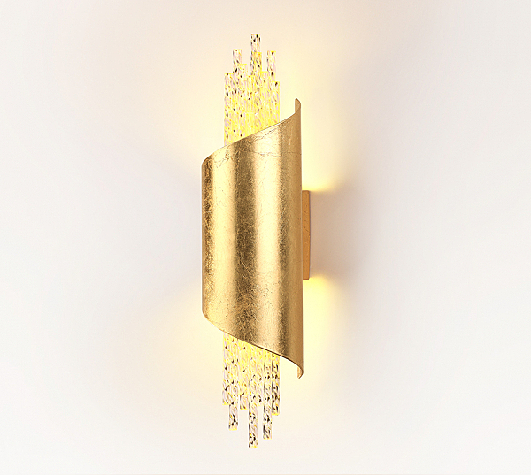 Эффектное сочетание материалов в настенном светильнике Monica никого не оставит равнодушным - мириада стеклянных трубочек в сочетании с ослепительным золотом фольгирования на металлическом основании завораживает своими лучами и отсветом на поверхности стены.