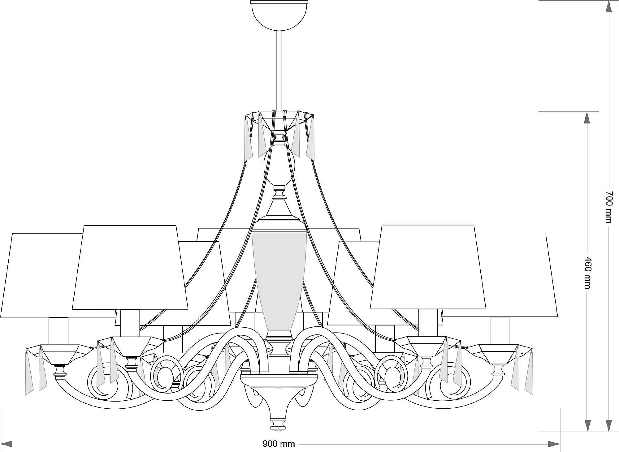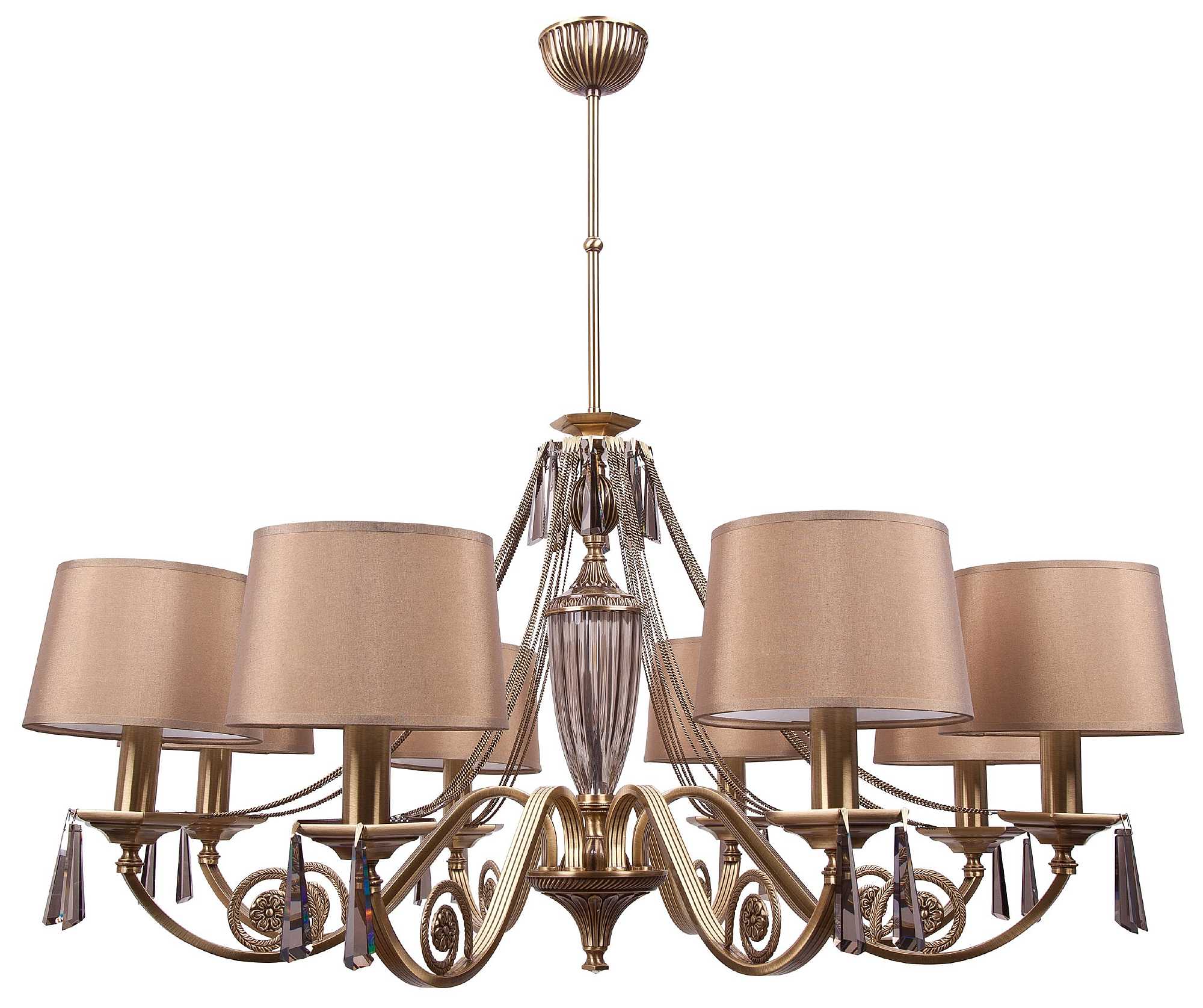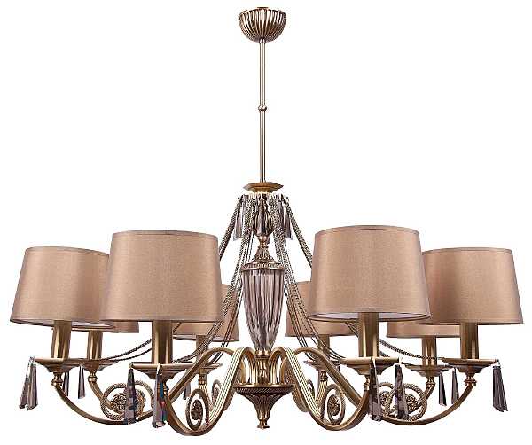 Восьмирожковая люстра MON-ZW-8 (P/A) - масштабная модель с патинированной арматурой и тканевыми абажурами. Предназначена для центрального освещения просторной комнаты: зала, гостиной или столовой. Симметрия и форма подчёркивают архитектуру помещения.