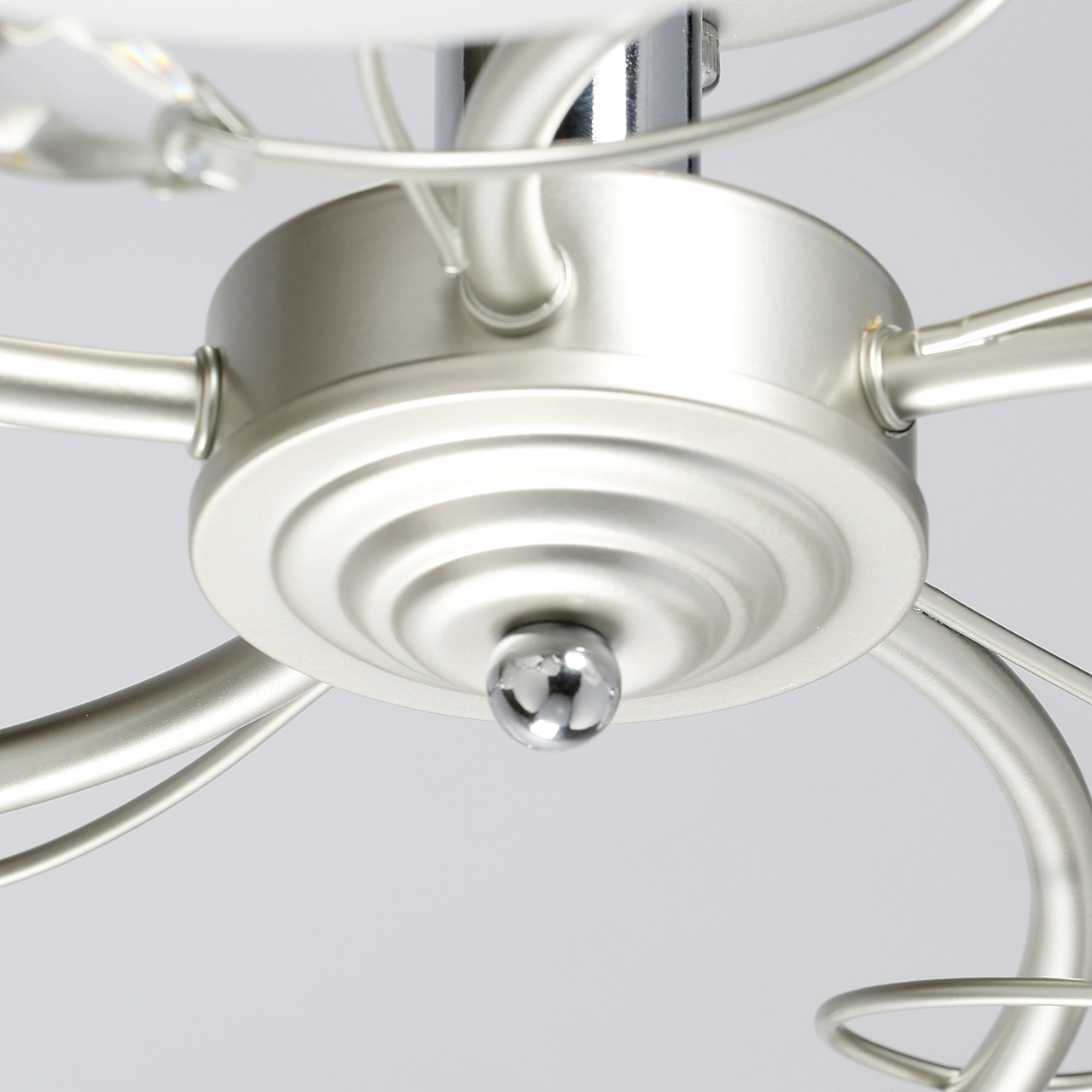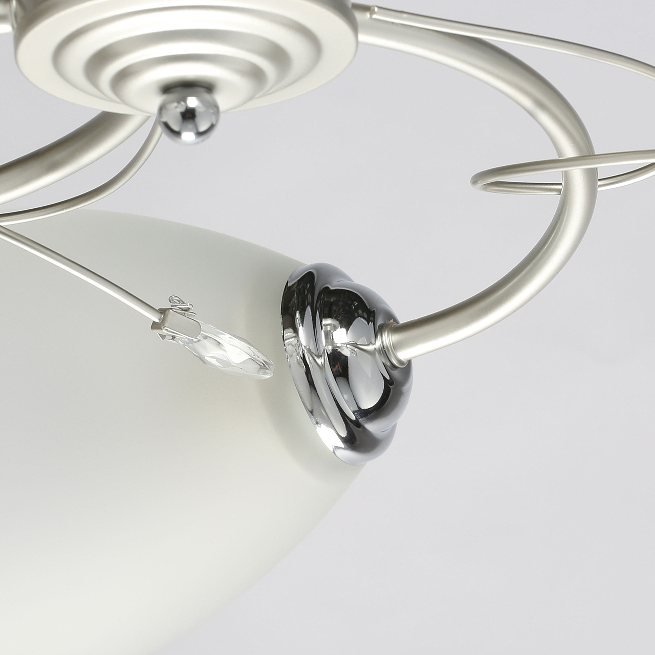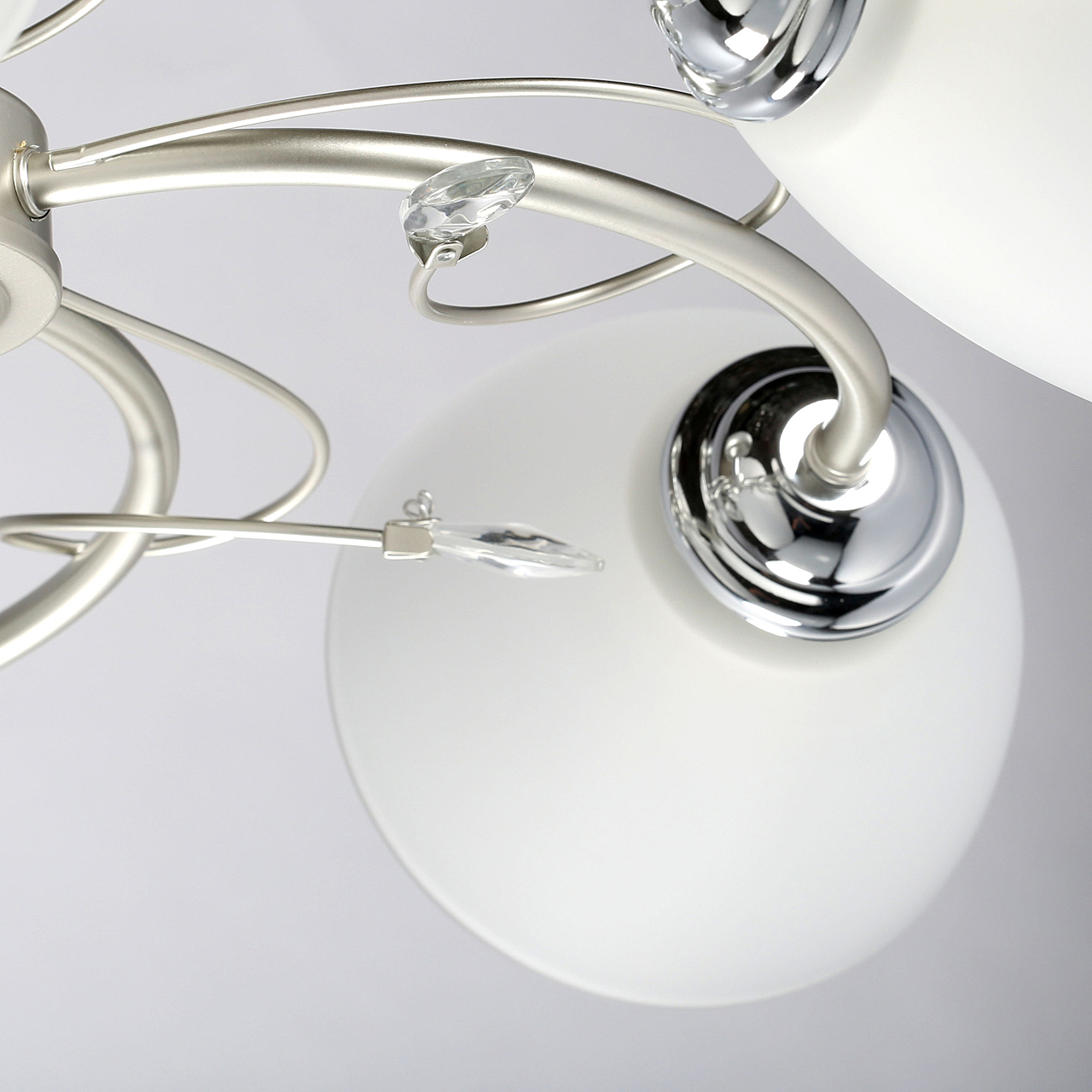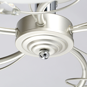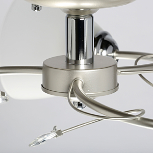 Компактная высота идеальна для стандартной высоты потолка.Плафоны матового белого стекла обеспечивают мягкое освещение.Хрустальный декор создает дополнительные акценты.Актуальная комбинация металлов цвета перламутрового серебра и глянцевого хрома.