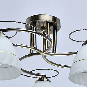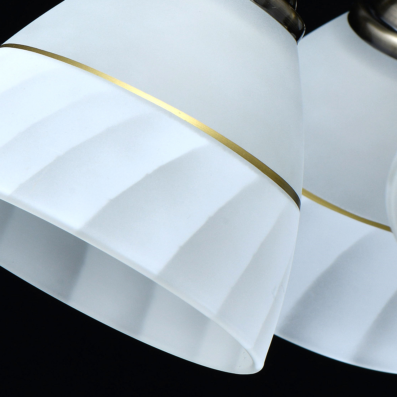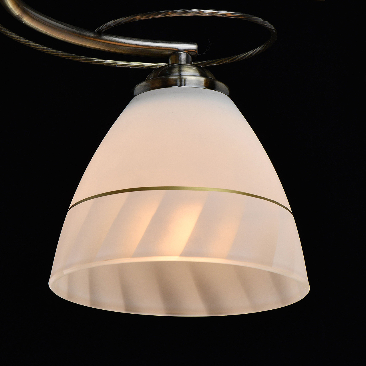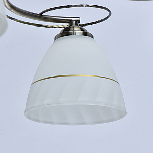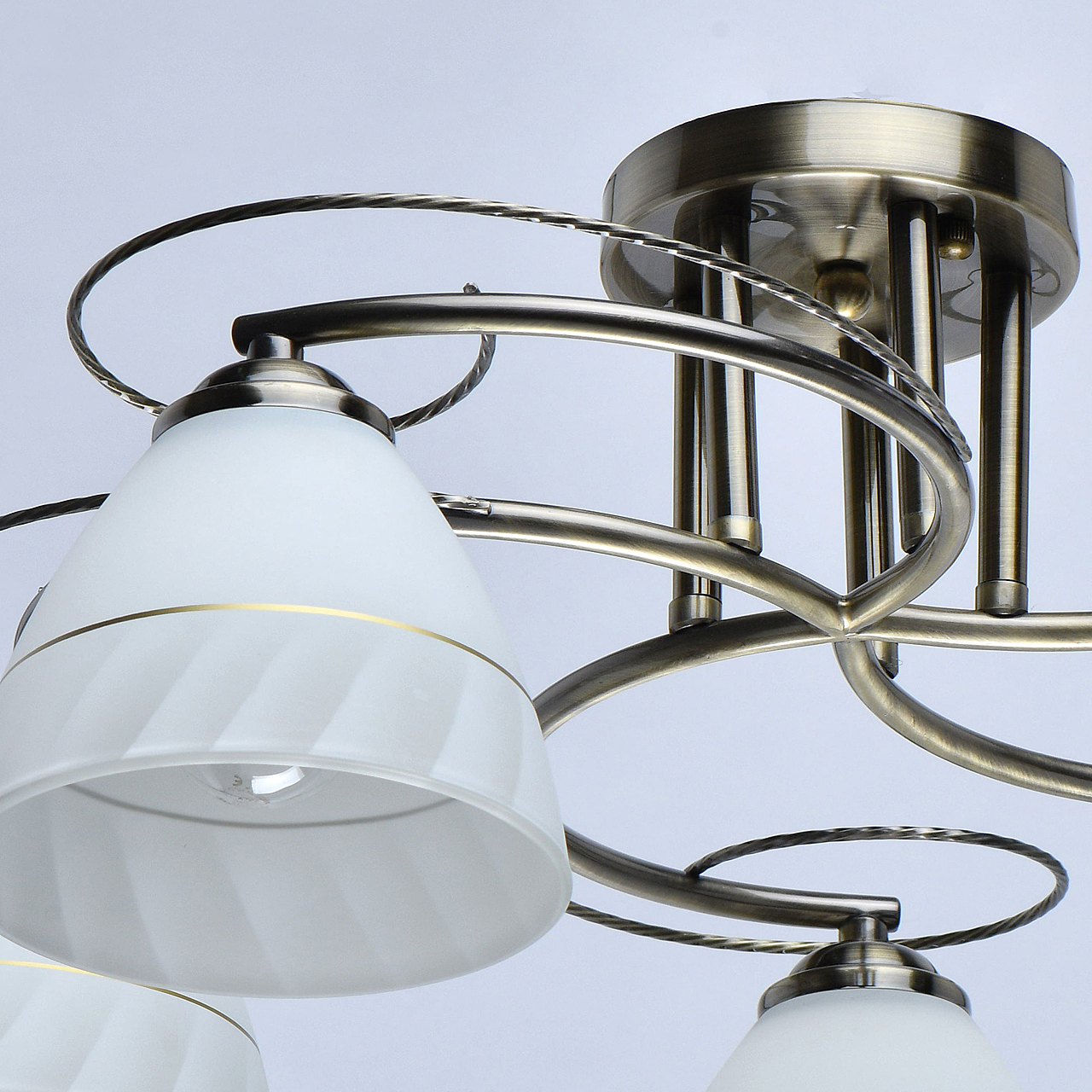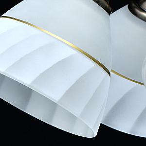 Классический цвет античной бронзы основания светильника.Плафоны с комбинированным рисунком и декоративным кантом обеспечивают мягкий световой поток.Компактная высота модели идеальна для стандартной высоты потолка.Металлический декор создает дополнительный акцент.