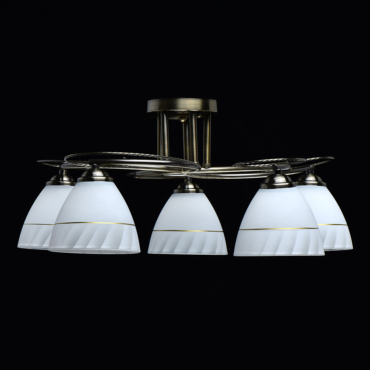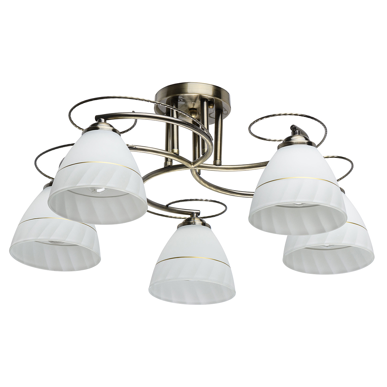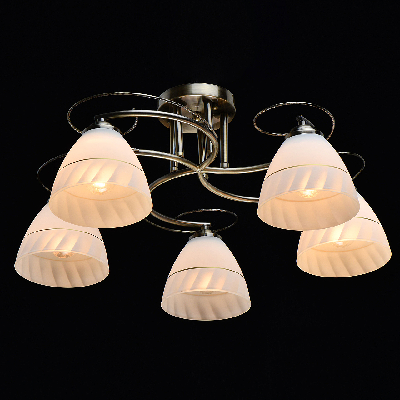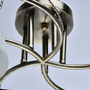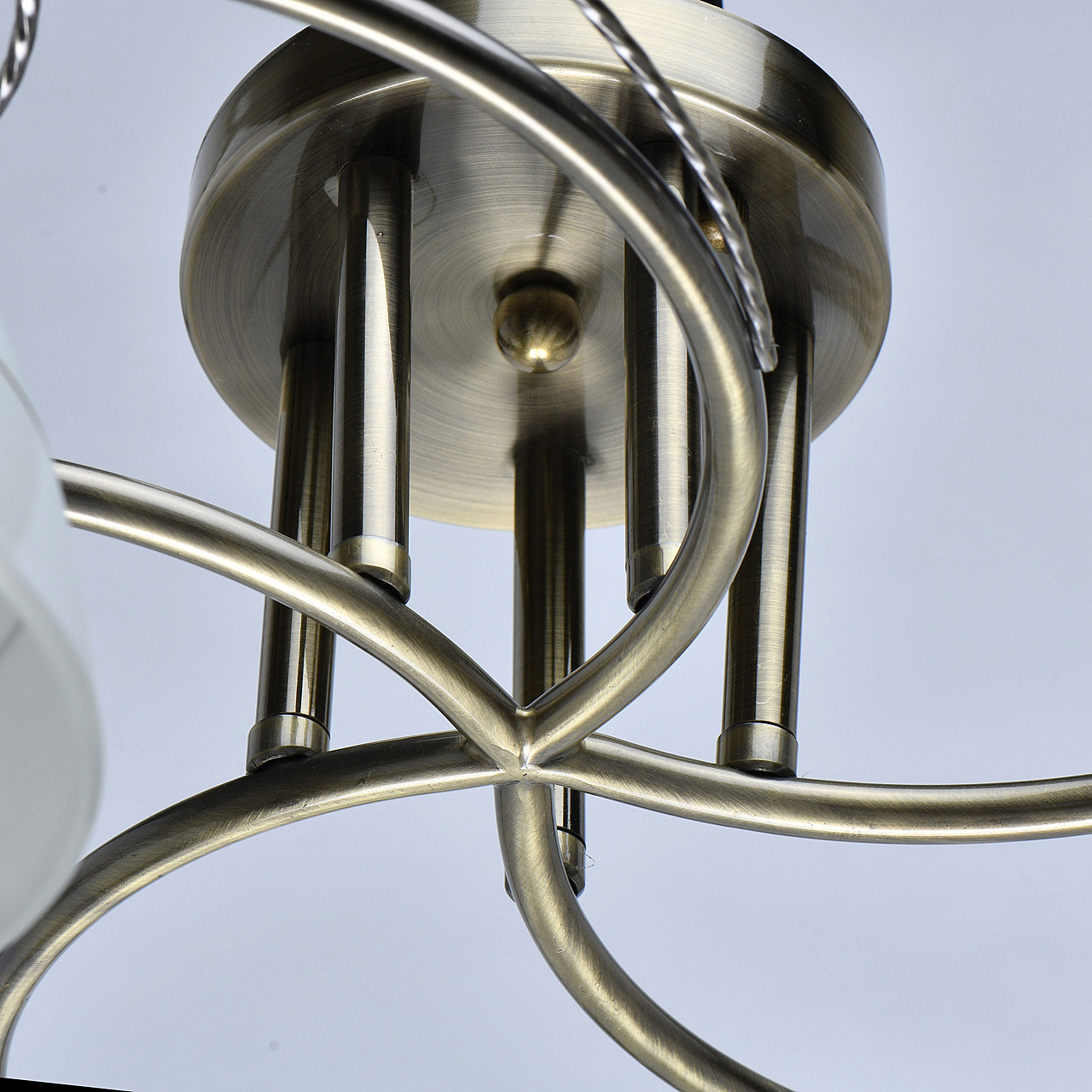 Классический цвет античной бронзы основания светильника.Плафоны с комбинированным рисунком и декоративным кантом обеспечивают мягкий световой поток.Компактная высота модели идеальна для стандартной высоты потолка.Металлический декор создает дополнительный акцент.