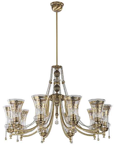 Люстра NIC-ZW-10 (P) - более торжественный вариант для центрального освещения просторного помещения. Патинированная арматура и 10 ламп делают её акцентным элементом в классическом интерьере.