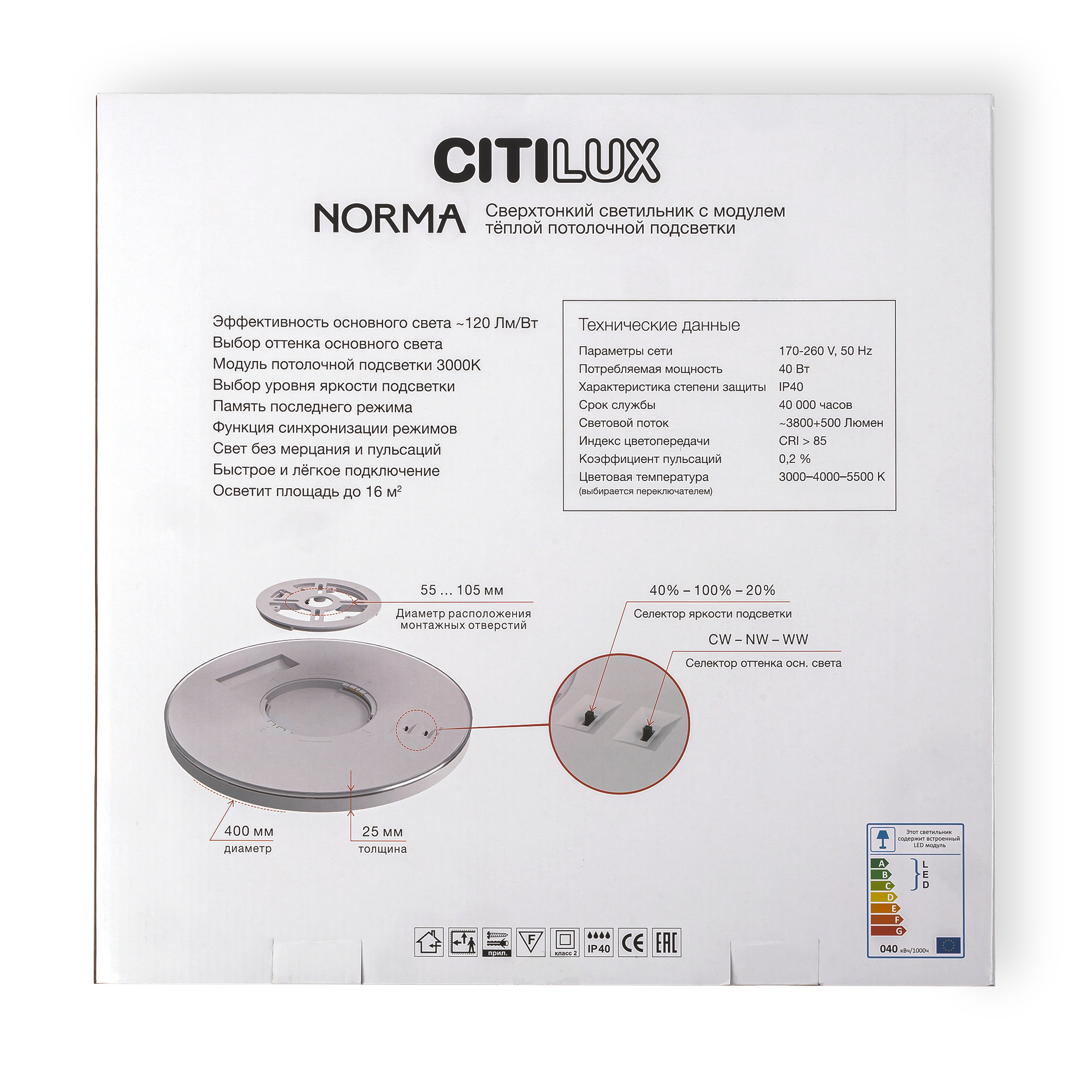 | Техническая оссобеность | Полностью светодиодная, Регулировка цветовой температуры |