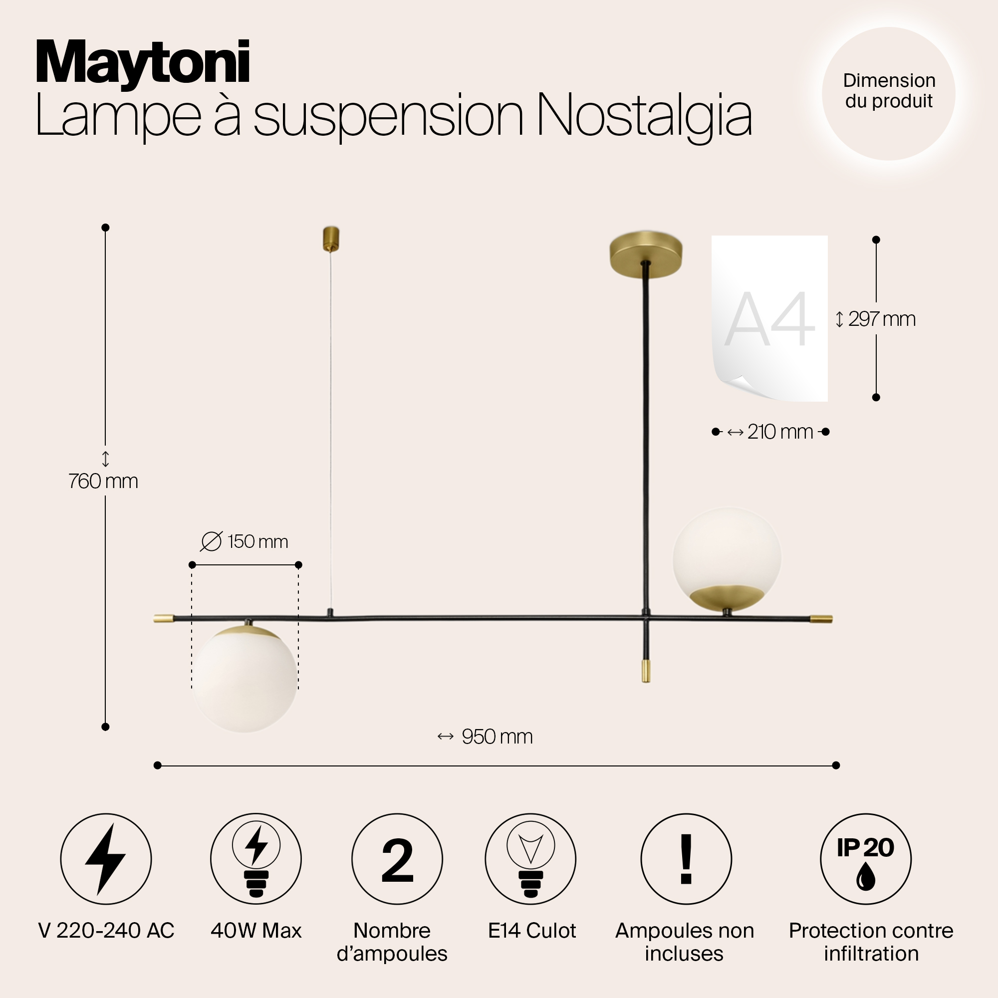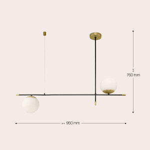 Допускается отличие страны-изготовителя, указанной в характеристиках. Линии производства могут находиться в нескольких государствах. Это не влияет на качество изготовления товара: все заводы данного бренда работают по общим стандартам, а готовые изделия проходят соответствующий контроль.Германия Коллекция Nostalgia ЦветЦвет арматуры Черный, матовое золото Цвет Черный Материал арматуры Металл Цвет плафона Белый Материал плафона Стекло Форма плафона Шар РазмерыВысота (мм) 760 Длина (мм) 950 Высота минимальная (мм) 760 Ширина (мм) 150 Диаметр абажура-плафона 150 ЭлектрикаКоличество ламп (шт) 2 Цоколь E14 Мощность лампы (Вт) 40 Напряжение (В) 220 Дополнительная информацияСпособ крепления Планка Степень защиты (IP) IP20 Вес (Кг) 1,31 Тип подвеса На тросах Количество подвесов Одиночный подвес -