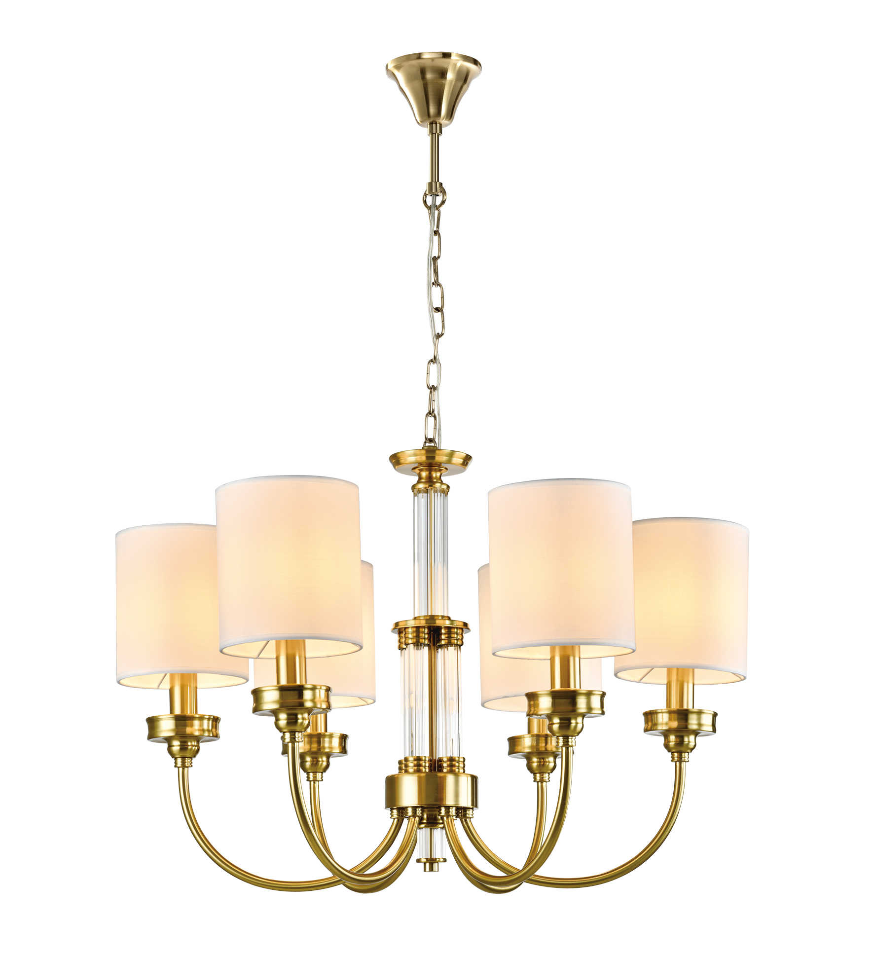Элегантная люстра сочетает в себе теплый оттенок каркаса из золота и белых абажуров, создавая обновленный взгляд на классический вид.