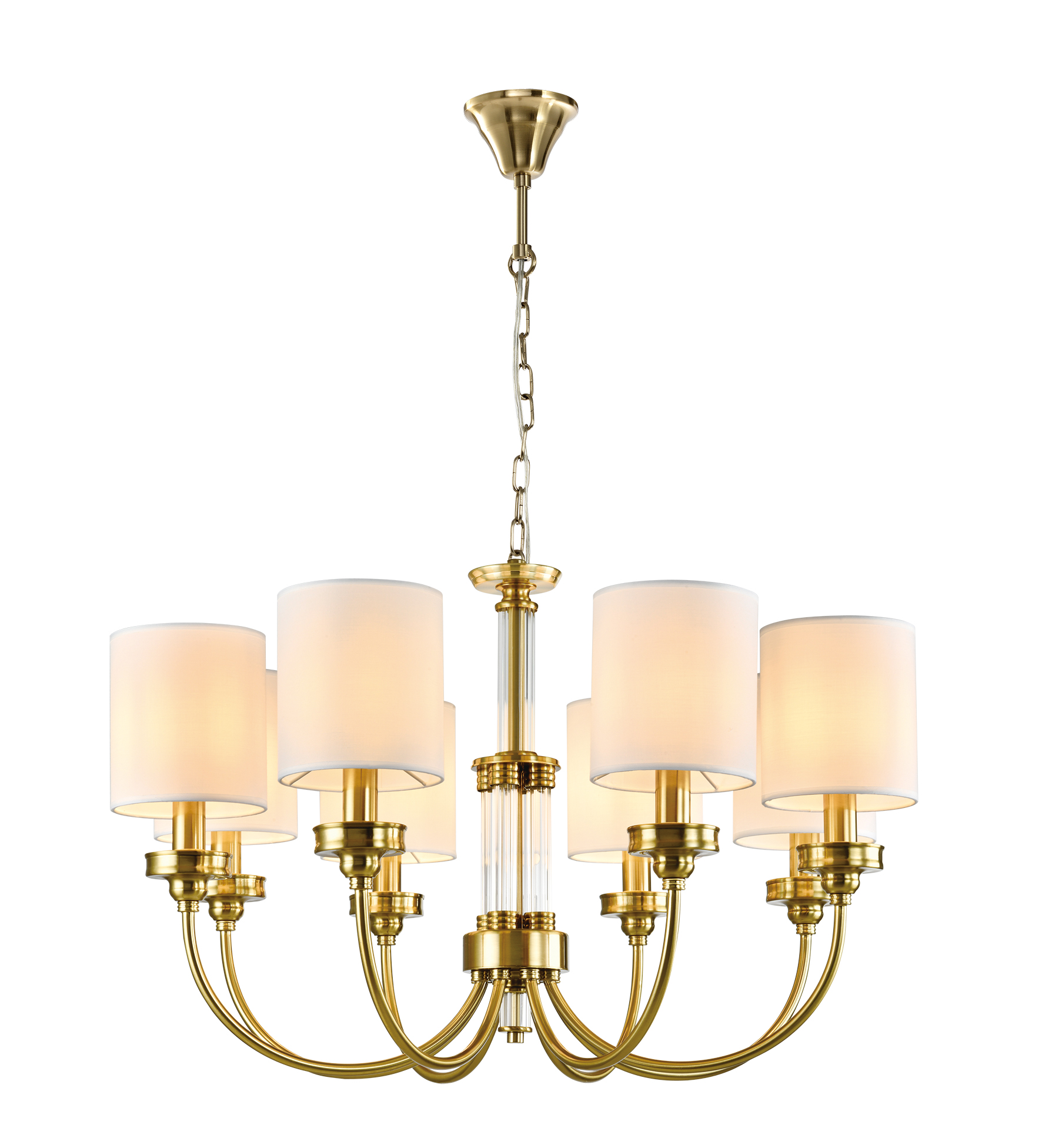 Элегантная люстра сочетает в себе теплый оттенок каркаса из золота и белых абажуров, создавая обновленный взгляд на классический вид.