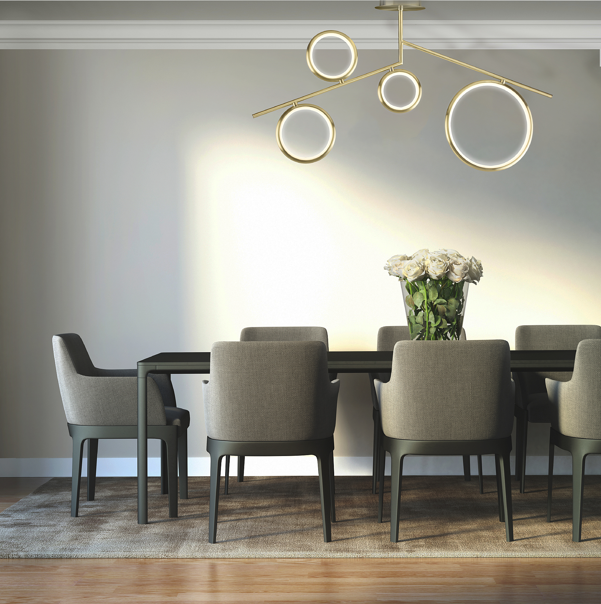 OLIMPIA - это комплексная коллекция, состоящая из тонких стержней металлического каркаса и колец со встроенными светодиодами 3000K. Для этой коллекции дизайнер Сантьяго Севиллано был вдохновлен волей и стойкостью спортсменов, которые обладают невозможной гибкостью и силой. Это восхищение совершенством отражено в форме; в идеальной линейности и окружности геометрии. Предметы коллекции словно плывут в воздухе. Сбалансированное и равномерное распределение света генерирует визуальный эффект, который усиливается, когда он отображен в нескольких световых композициях.Доступная в золотой и хромированной отделке, OLIMPIA обладает универсальностью, подходящей для широкого разнообразия интерьеров. Коллекция станет отличным дополнением для гостиной и рабочей зоны в современном стиле.
