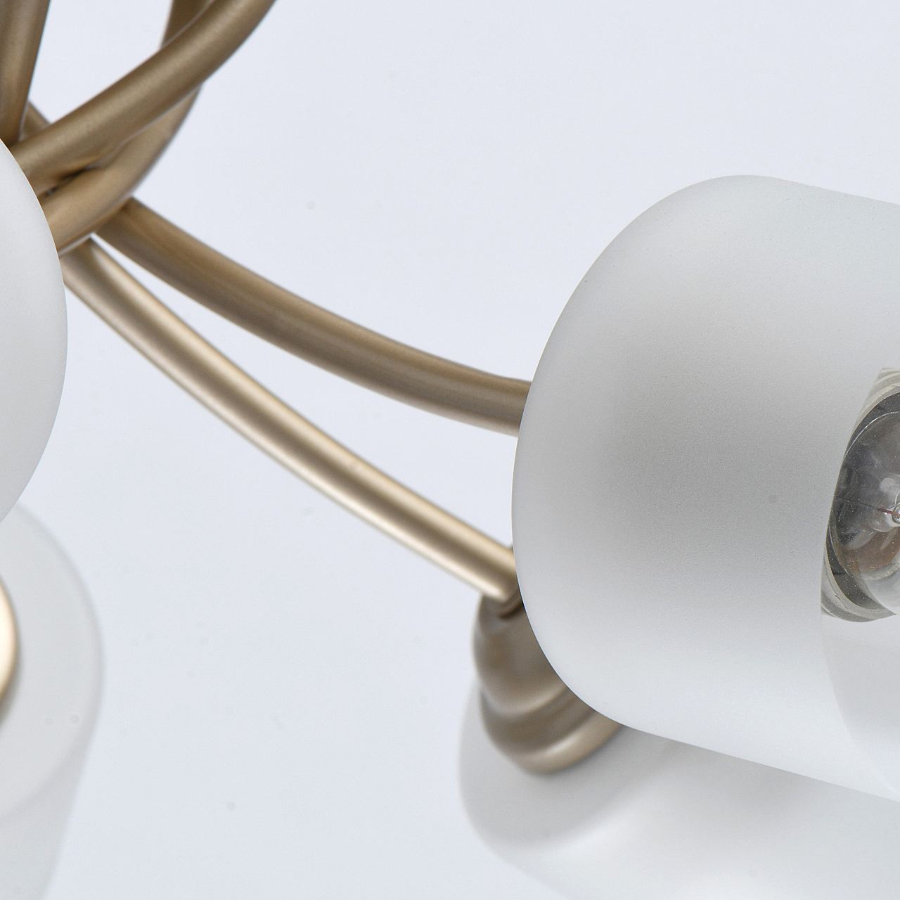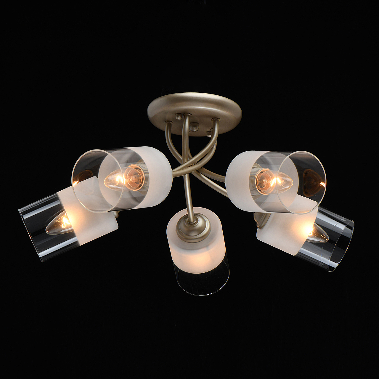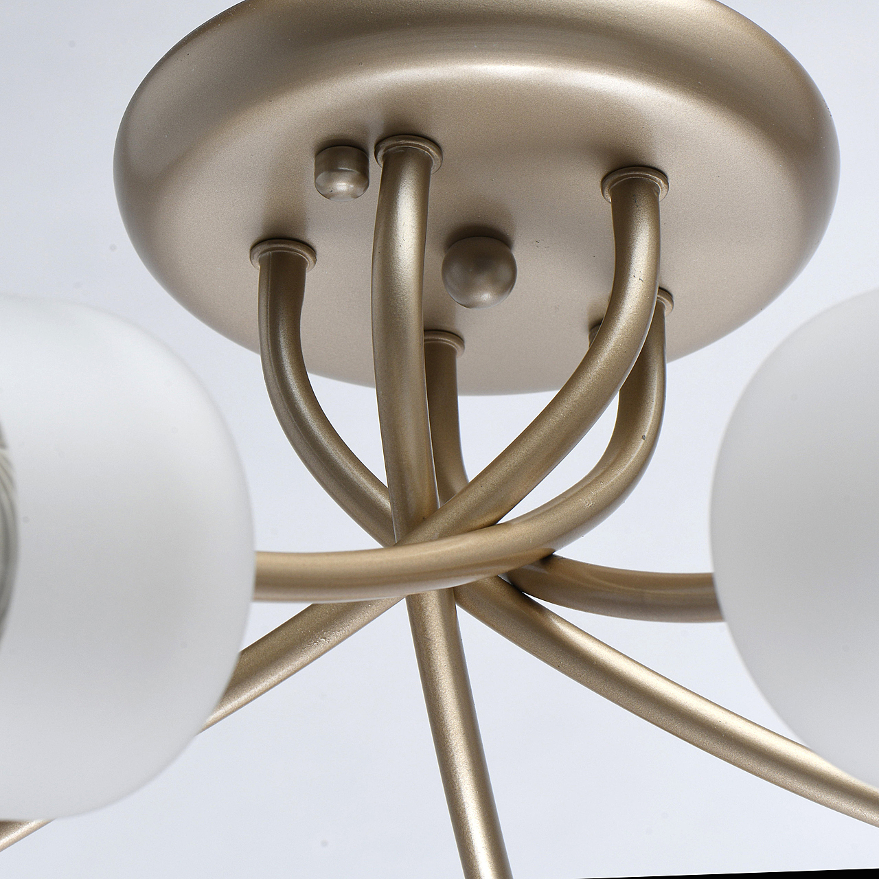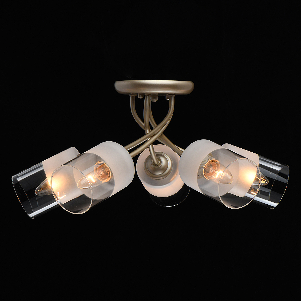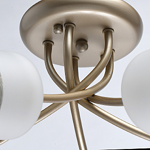 Лаконичный стиль модели универсальное решение для интерьеров различной стилистики.Основание светильника выполнено в модном цвете перламутрового золота.Стеклянные, частично матированные плафоны обеспечивают мягкий световой поток.Прозрачная часть плафонов придает модели дополнительную легкость. Компактные размеры светильника по высоте идеальны для стандартных потолков.