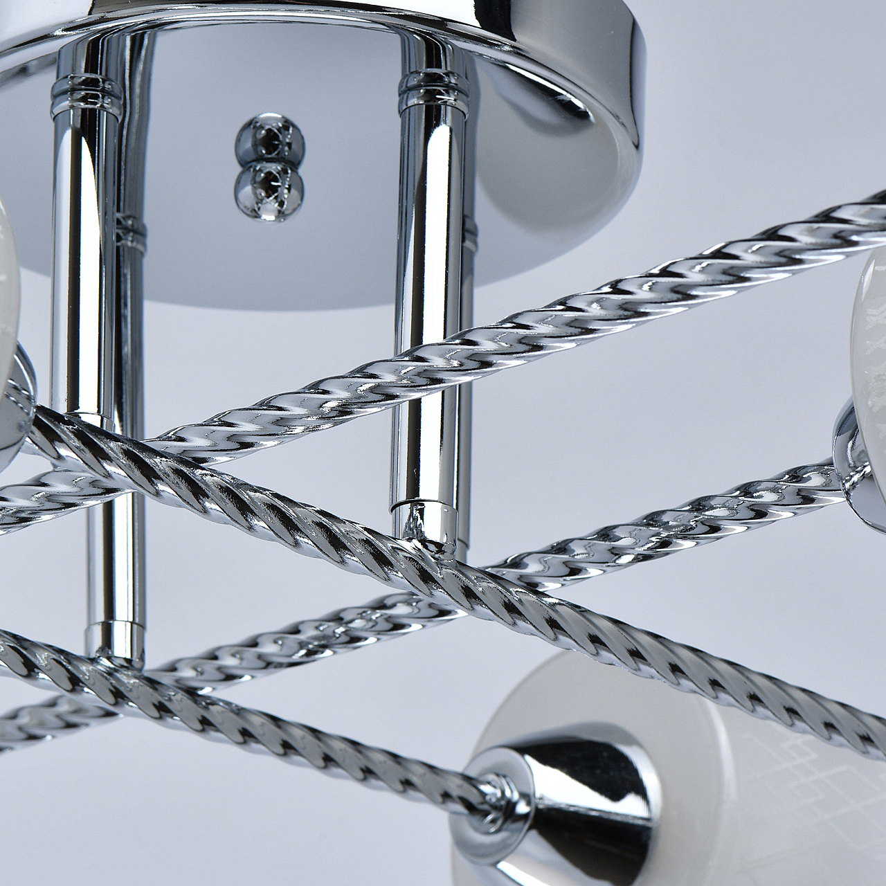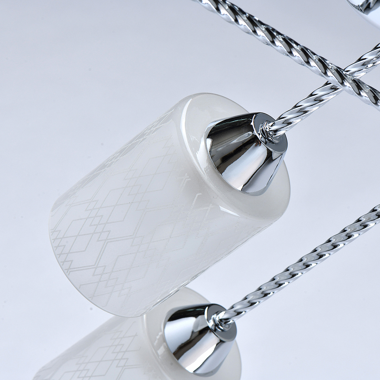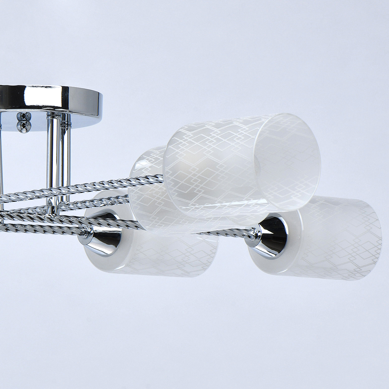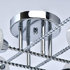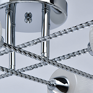 Компактная высота идеальна для стандартной высоты потолка.Плафоны матового белого стекла с орнаментом обеспечивают мягкое освещение.Витые рожки светильника сочетаются фактурными плафонами.Заменяемые источники света удобны в эксплуатации.