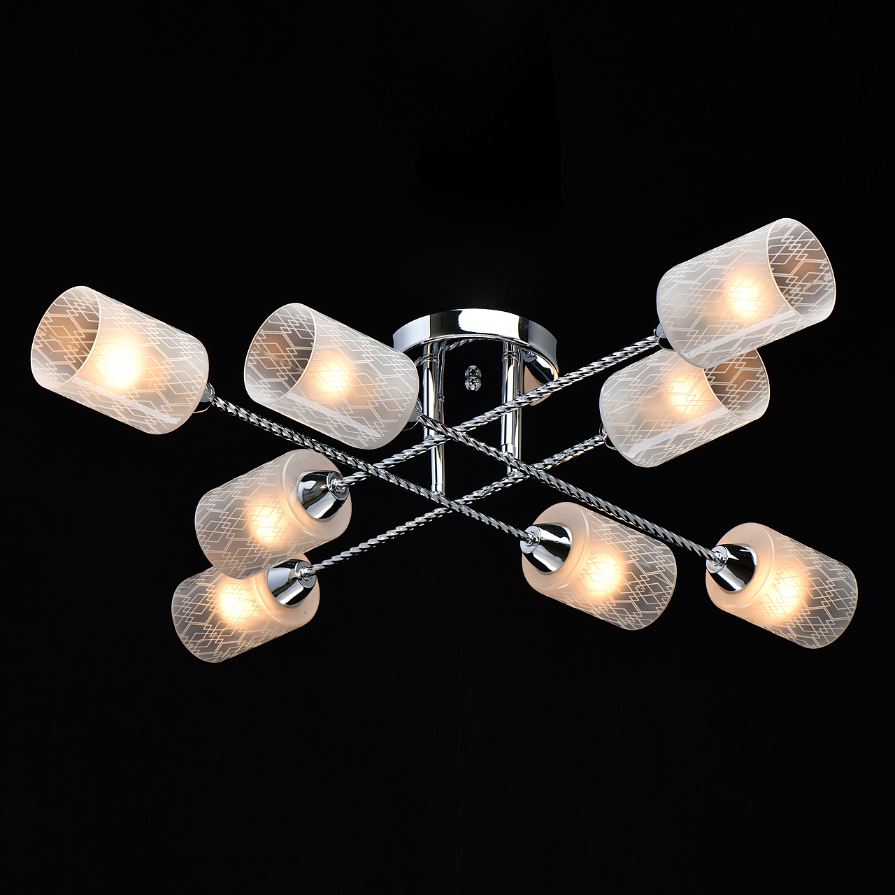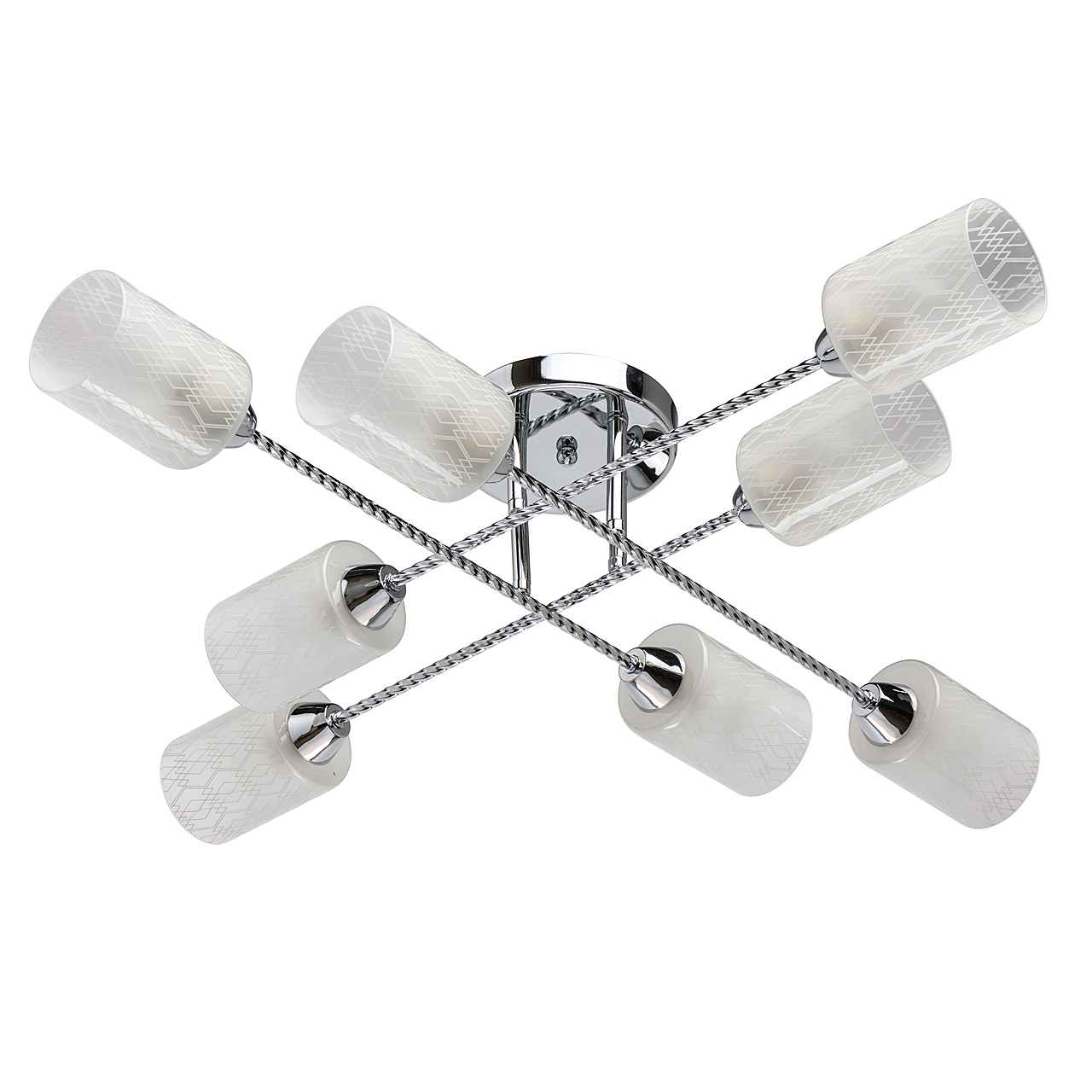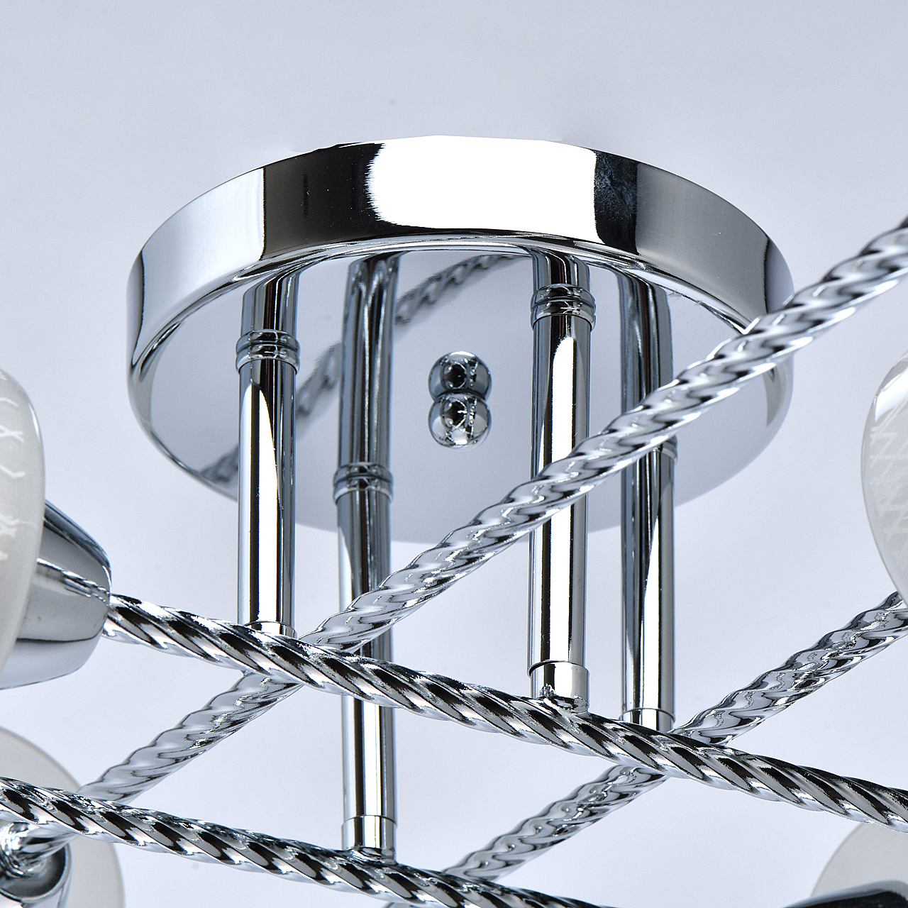 Компактная высота идеальна для стандартной высоты потолка.Плафоны матового белого стекла с орнаментом обеспечивают мягкое освещение.Витые рожки светильника сочетаются фактурными плафонами.Заменяемые источники света удобны в эксплуатации.