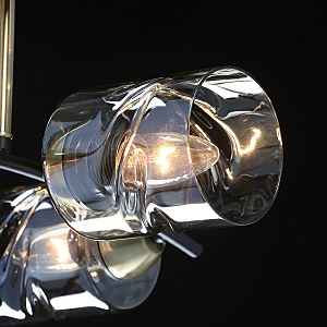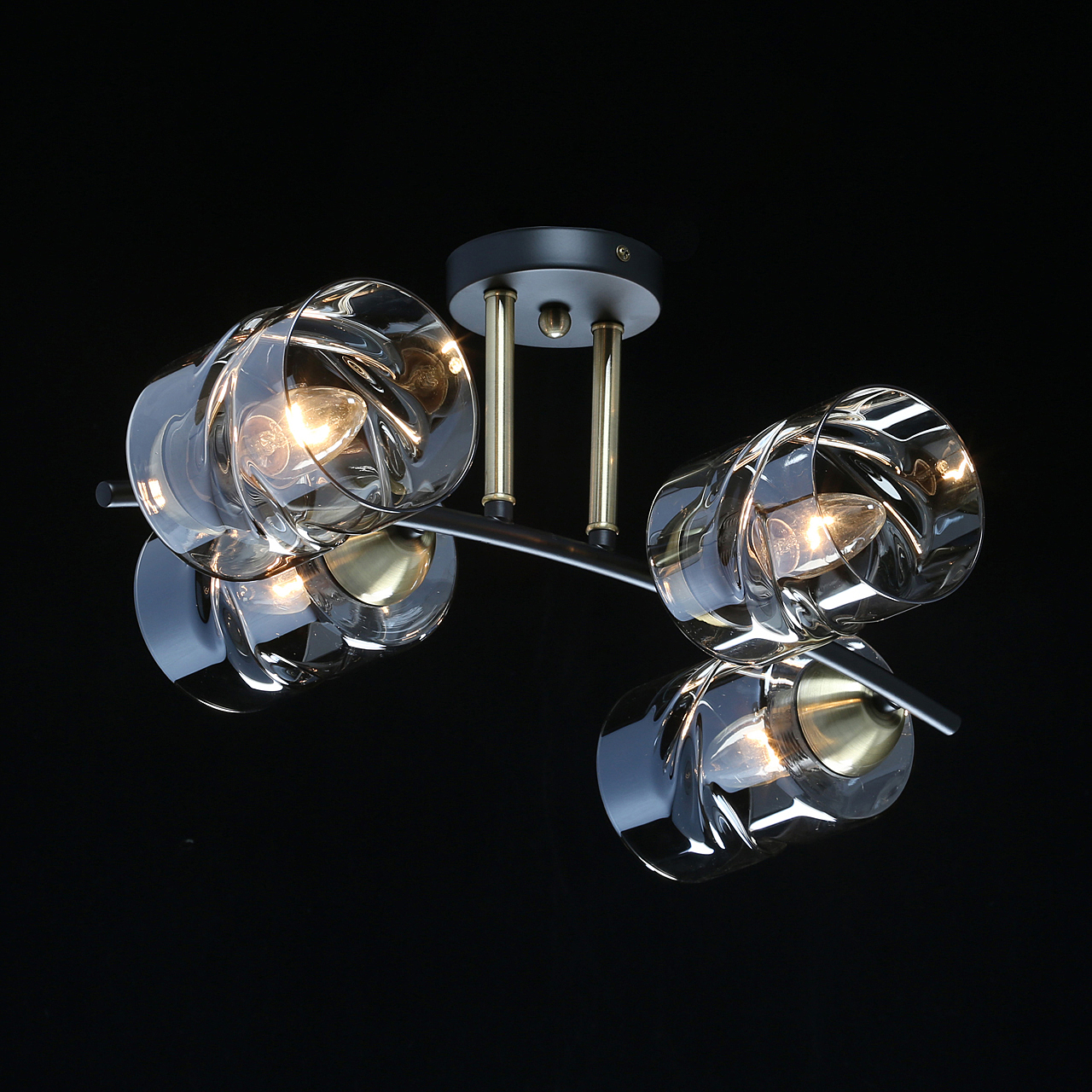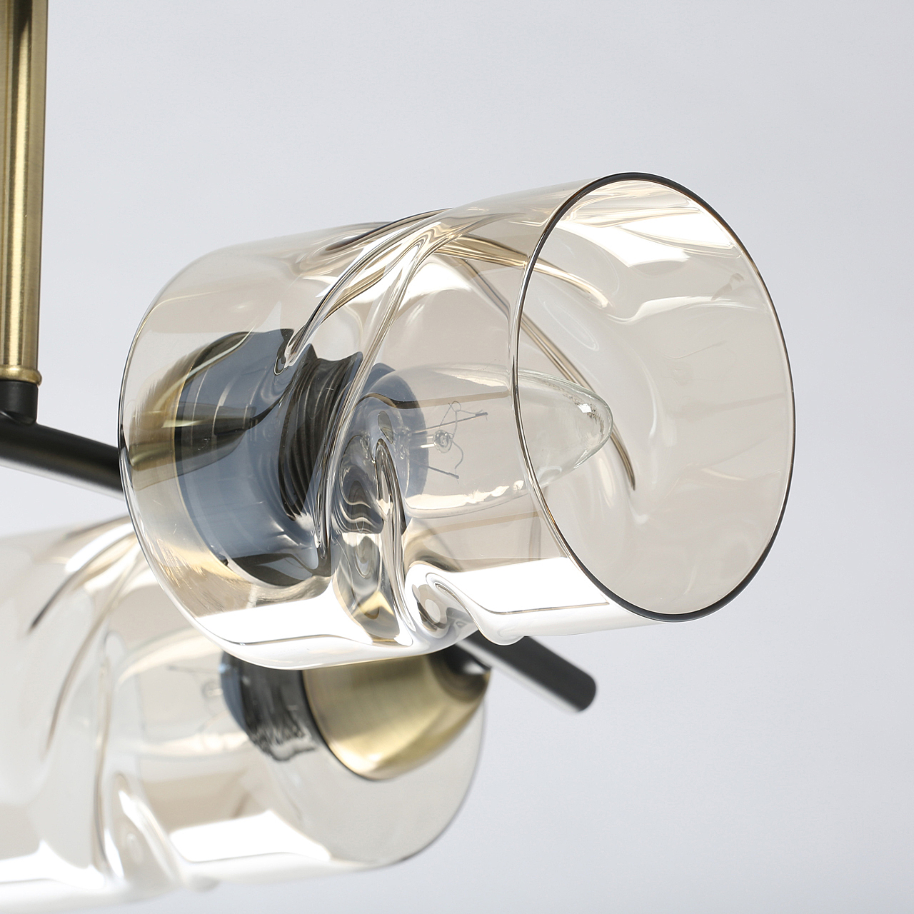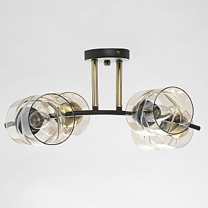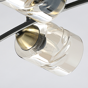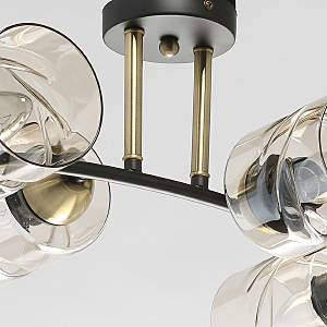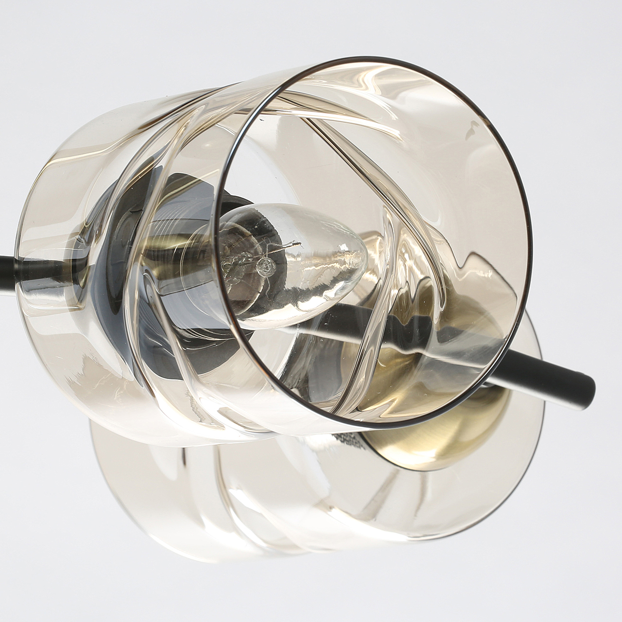 Компактная высота модели идеальна для стандартной высоты потолка.Комбинация фактур металла черного цвета и античной бронзы в тренде.Плафоны скрученной формы из тонированного стекла обеспечивают мягкий световой поток. Заменяемые источники света удобны в эксплуатации.