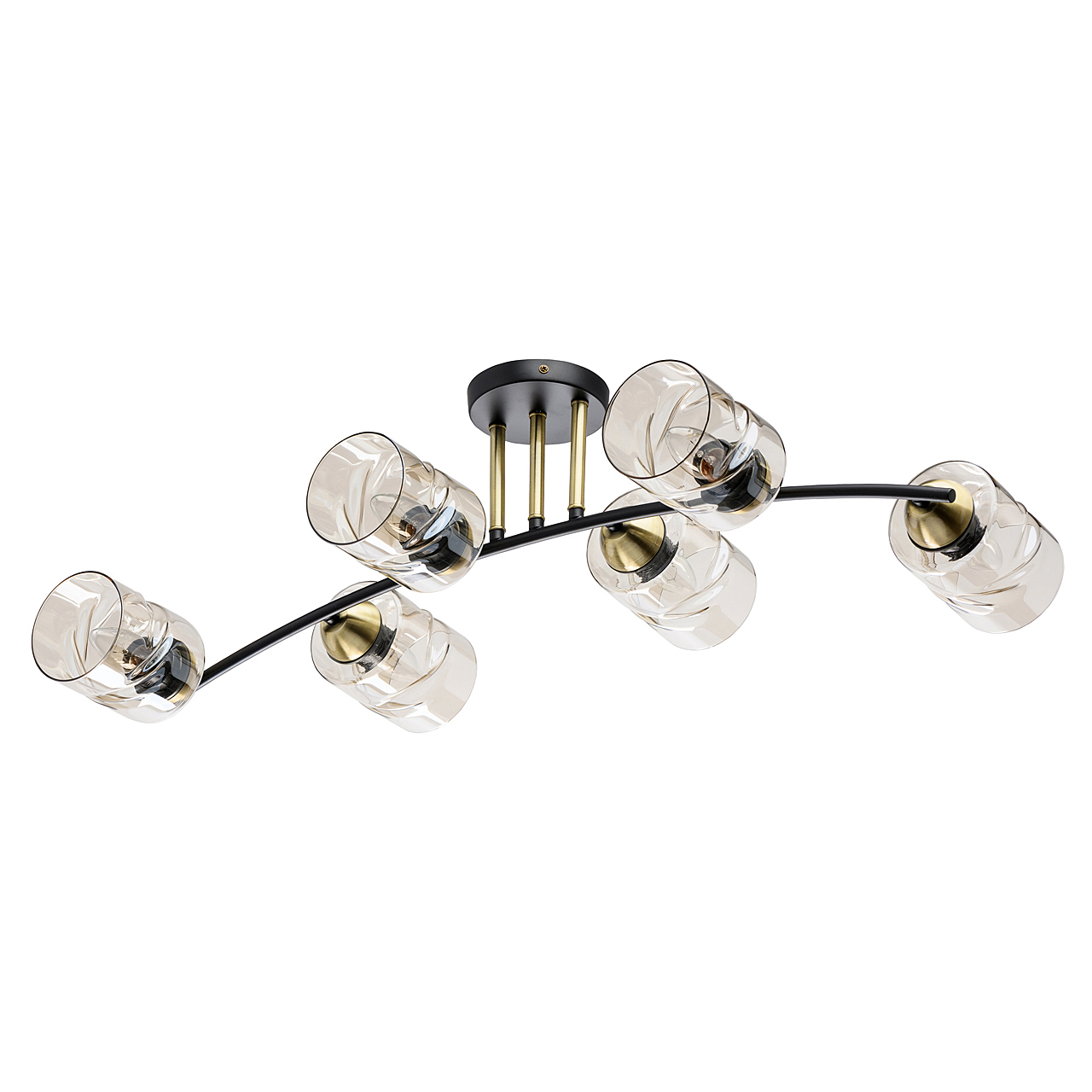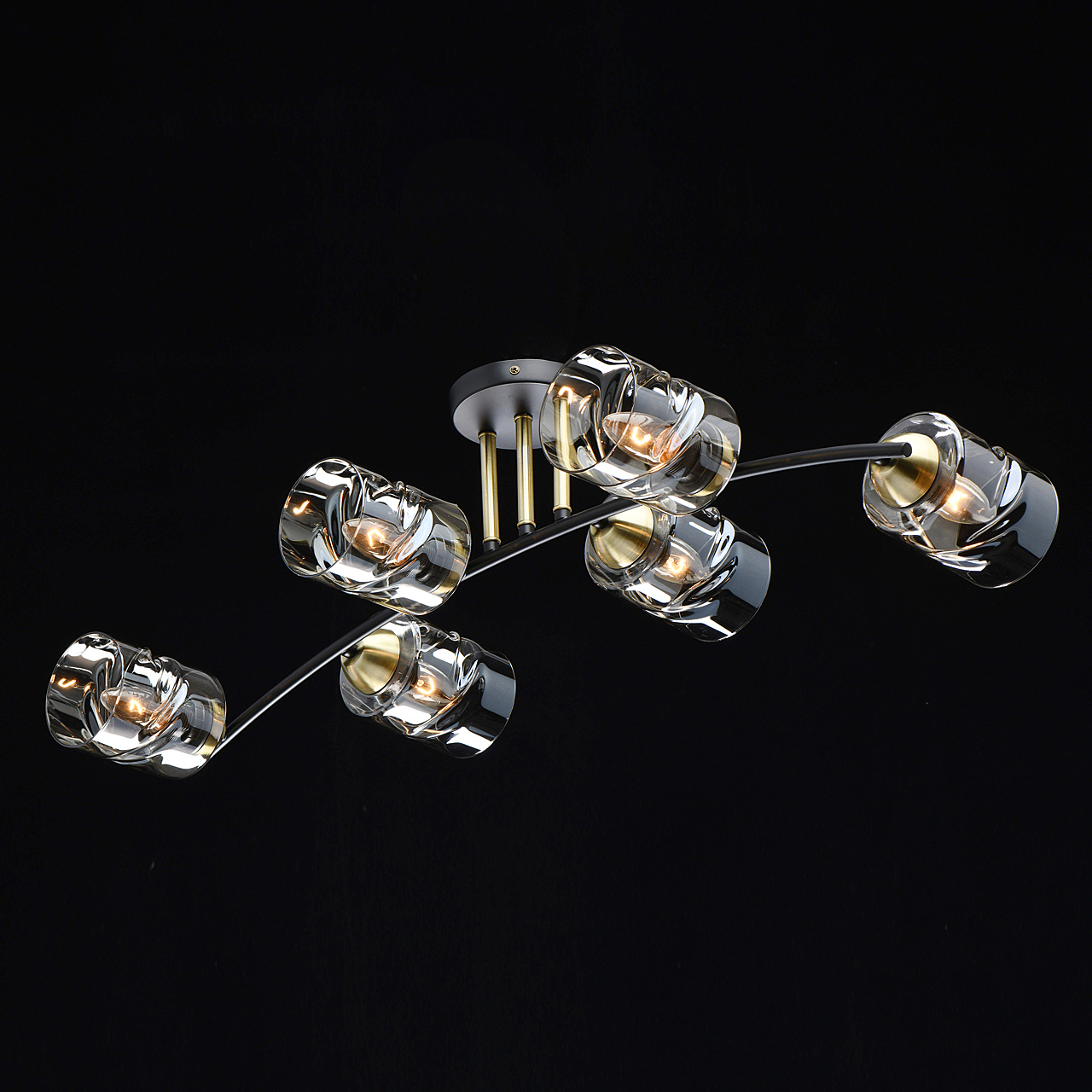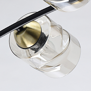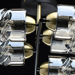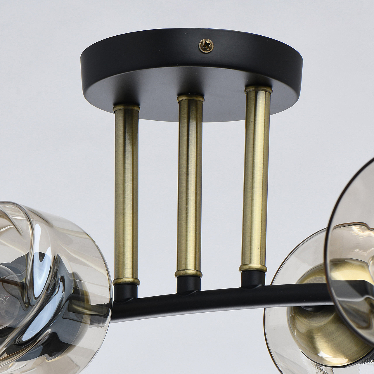 Компактная высота модели идеальна для стандартной высоты потолка.Комбинация фактур металла черного цвета и античной бронзы в тренде.Плафоны скрученной формы из тонированного стекла обеспечивают мягкий световой поток. Заменяемые источники света удобны в эксплуатации.