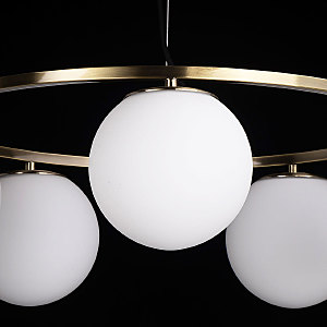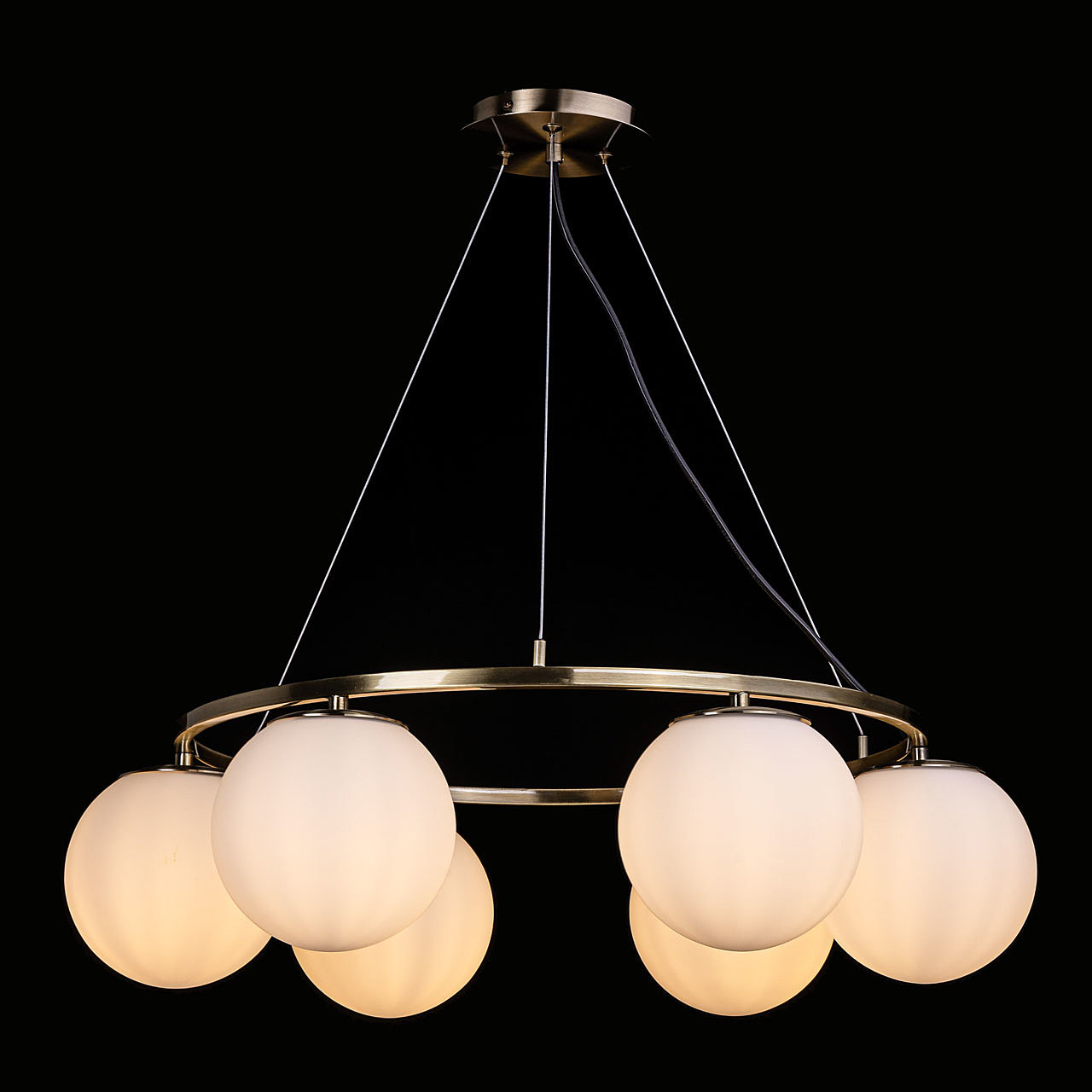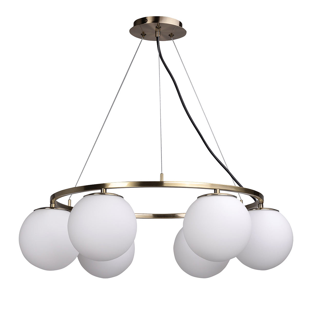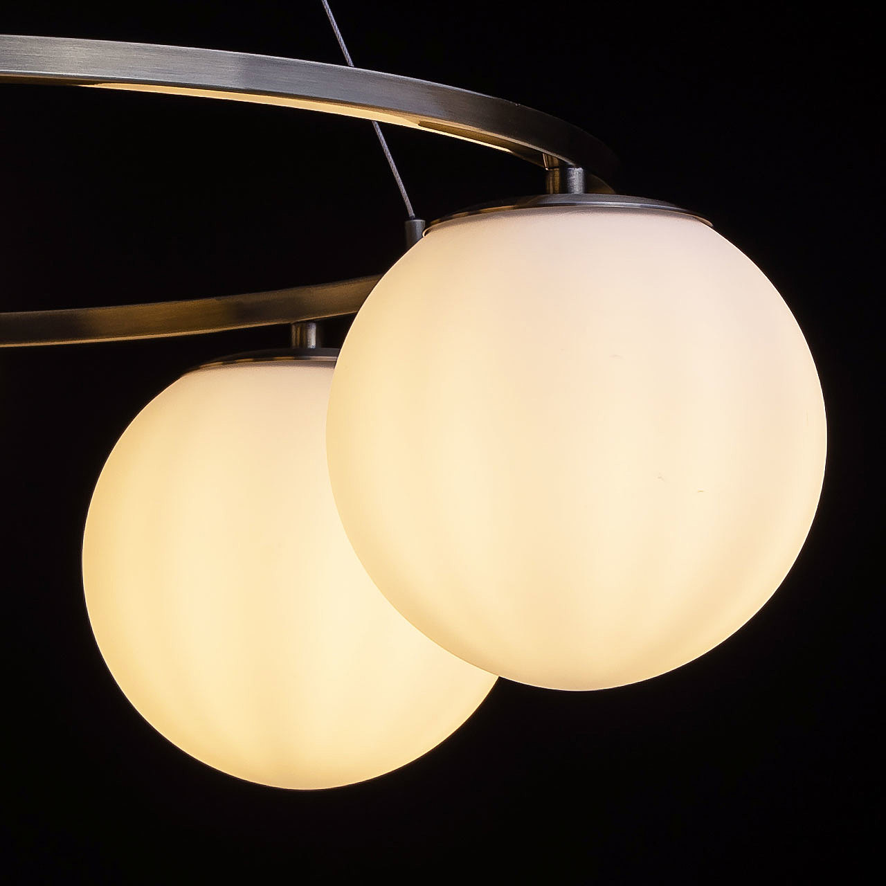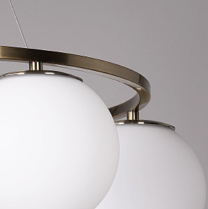 Подвесной светильник в современном дизайне хорошо подойдет в гостиную, спальню, кухню.Модный цвет античной бронзы сохраняет свою актуальность.Декор из стеклянных плафонов белого цвета обеспечивает комфортное освещение.Подвесы в виде тросов позволяют устанавливать комфортную высоту. Заменяемые источники света удобны в эксплуатации.