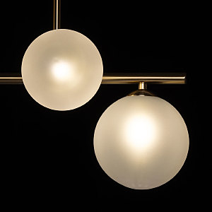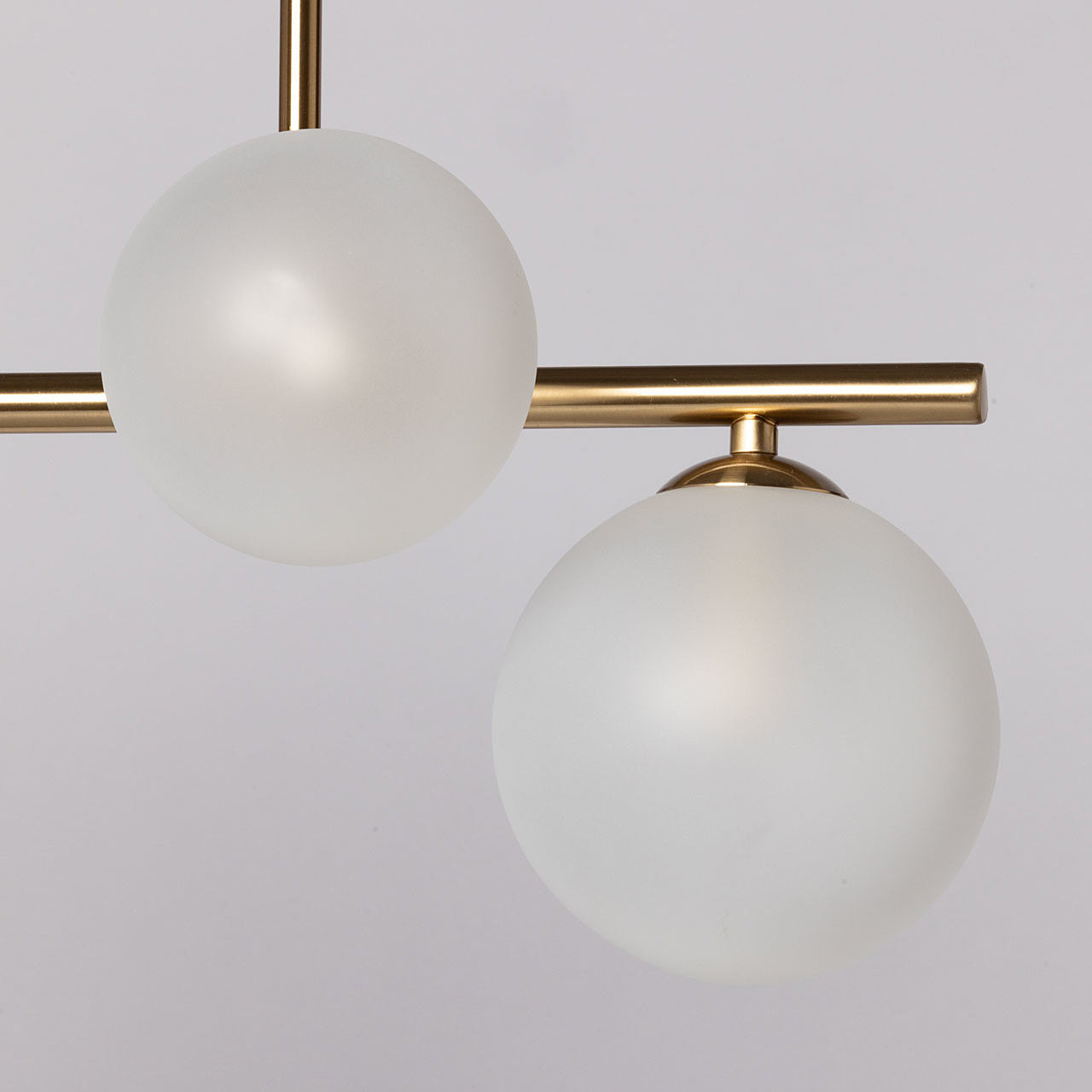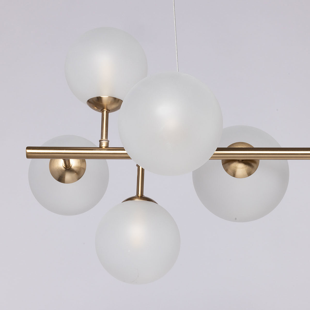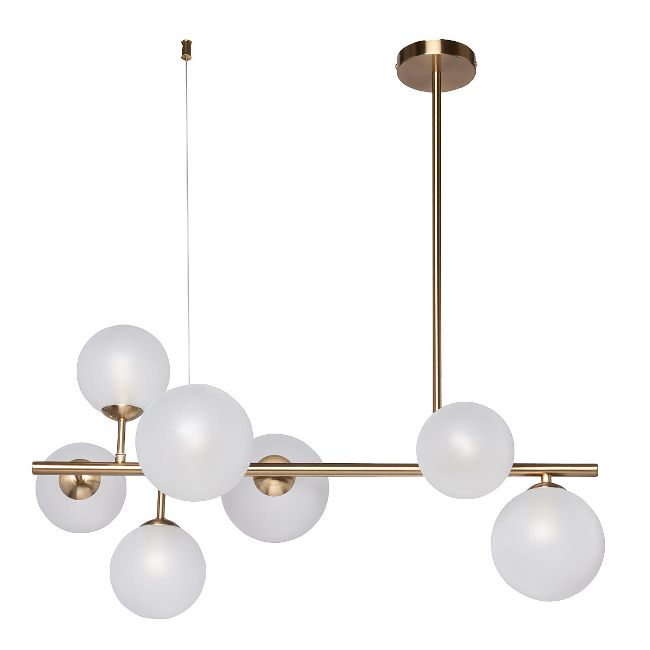 Необычный цвет латуни притягивает к себе внимание. Ассиметричное расположение стеклянных плафонов придает люстре индивидуальность. Матированные плафоны мягко рассеивают свет и создают комфортное освещение. Заменяемые источники света удобны в эксплуатации. Возможность регулировать комфортную высоту.