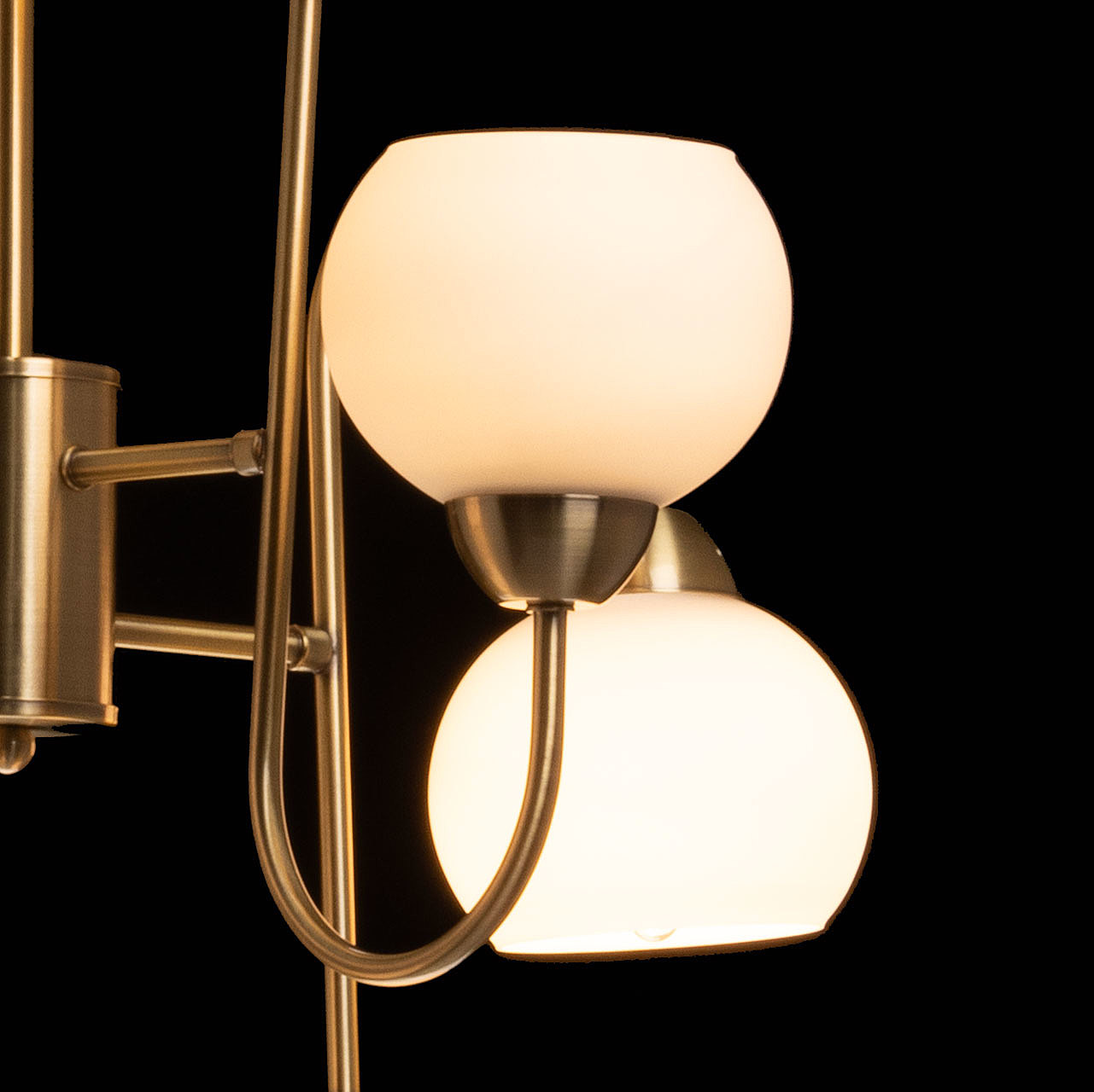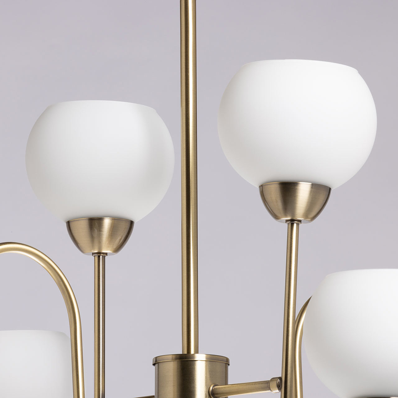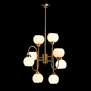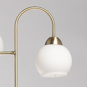 Актуальный цвет латуни придает люстре благородства и изящности. Стеклянные плафоны белого цвета создают мягкое комфортное освещение. Разнонаправленное расположение плафонов позволяет ярко осветить комнату. Заменяемые источники света удобны в эксплуатации.