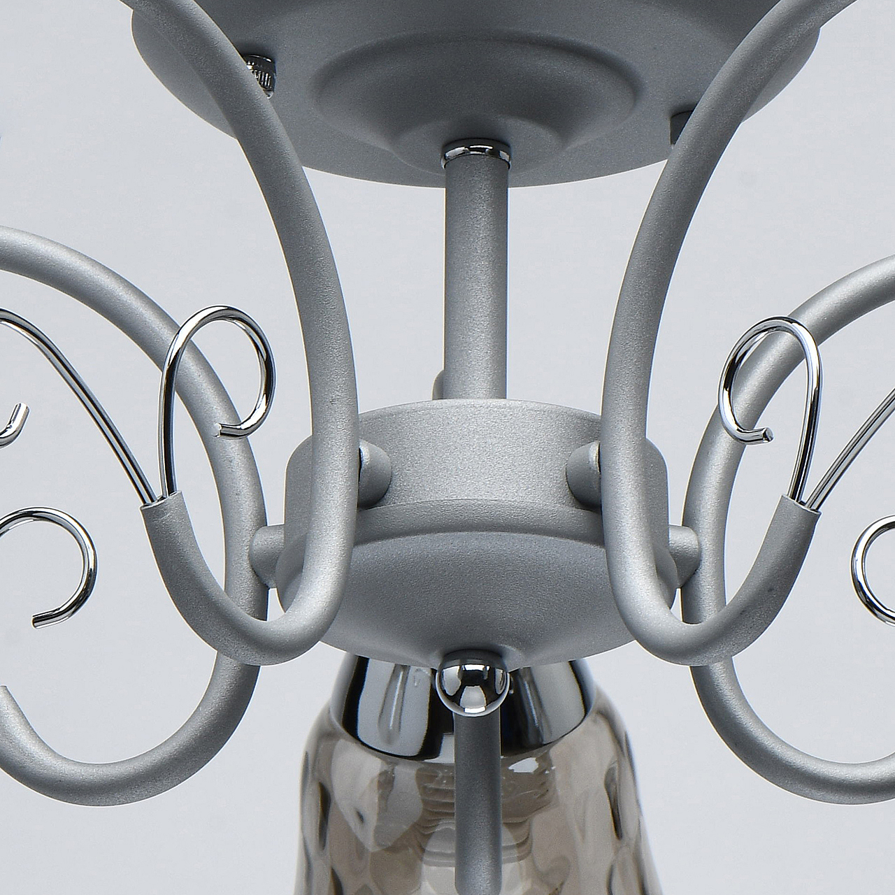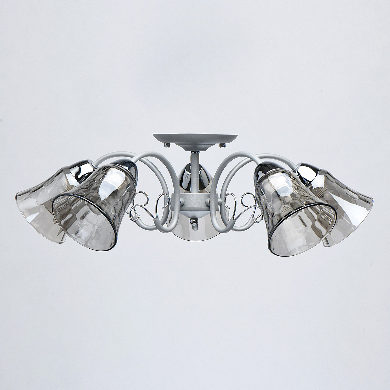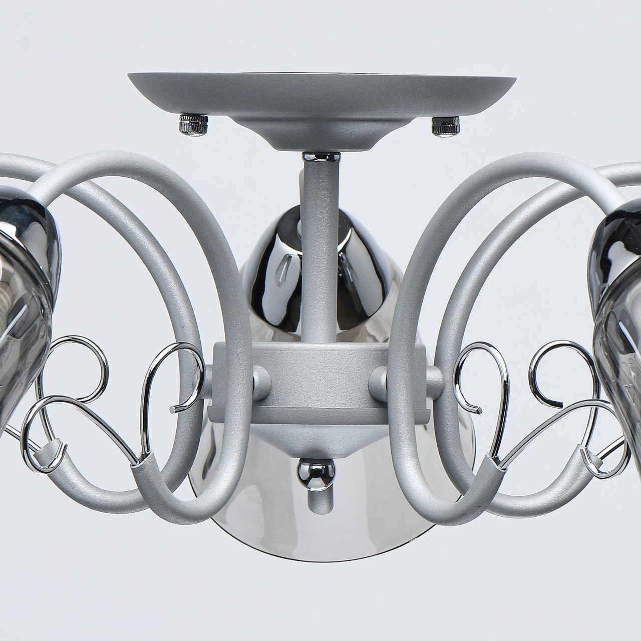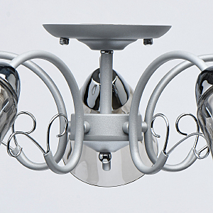 Новый оттенок серебра в сочетании с глянцевым хромом актуален в современных интерьерах.Стекло плафонов в дымчатом цвете обеспечивает комфортный световой поток.Рельефные плафоны создают игру света.Компактная высота модели идеальна для стандартной высоты потолка.