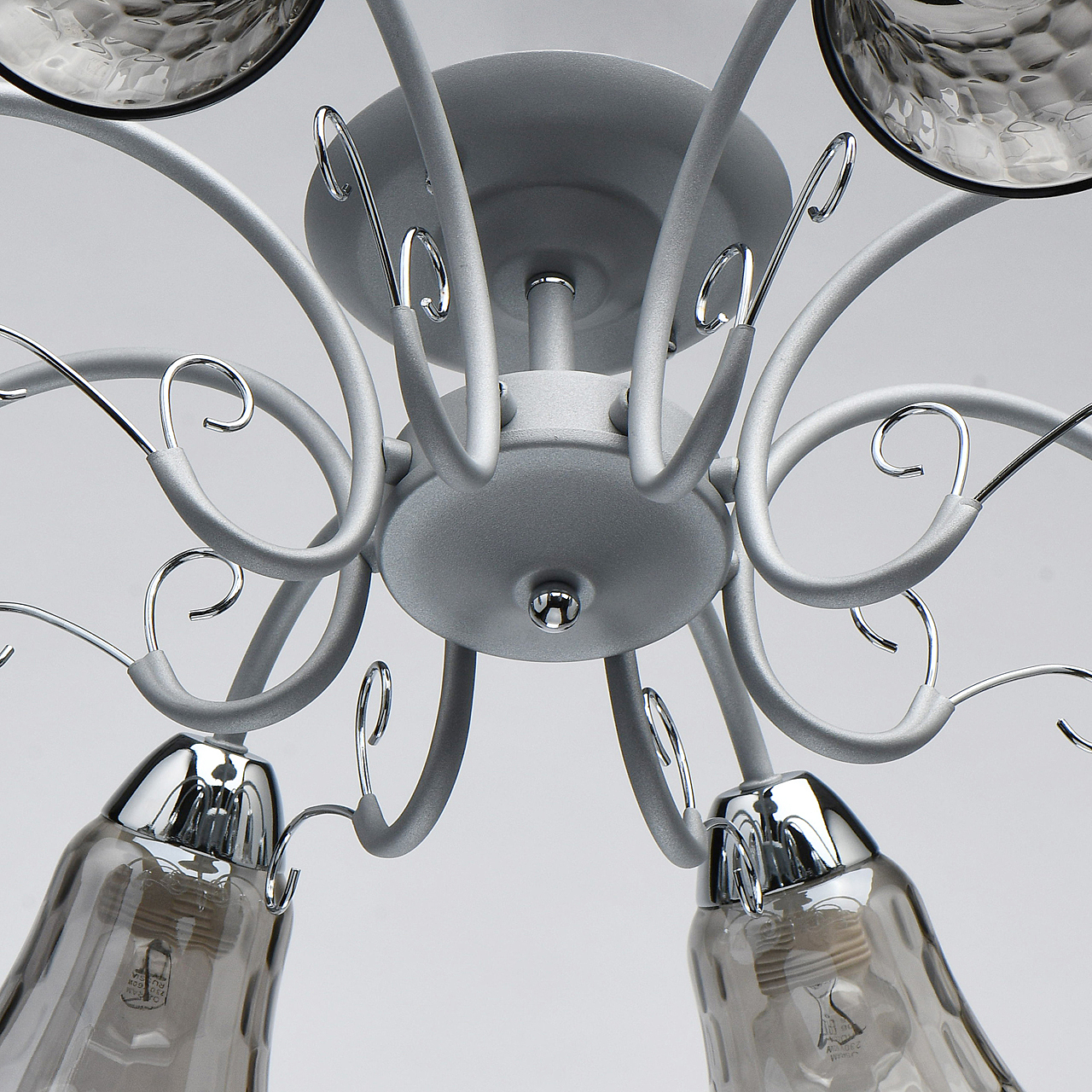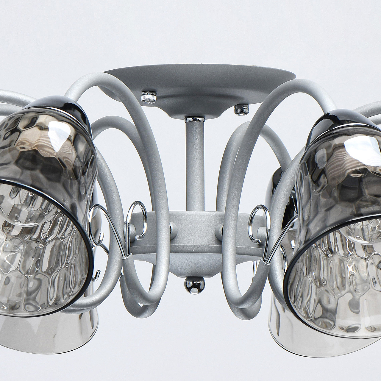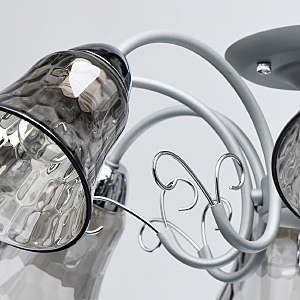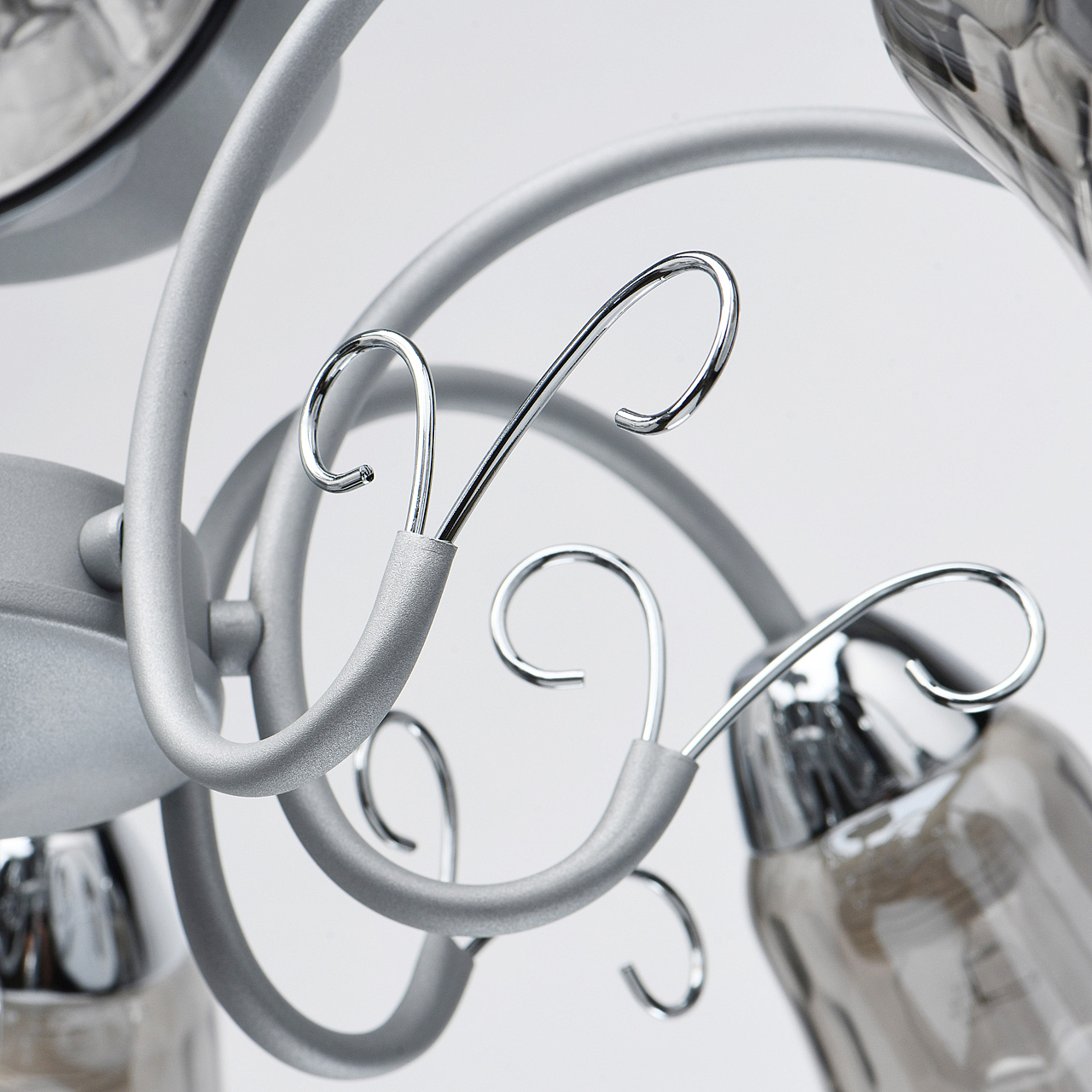 Новый оттенок серебра в сочетании с глянцевым хромом актуален в современных интерьерах.Стекло плафонов в дымчатом цвете обеспечивает комфортный световой поток.Рельефные плафоны создают игру света.Компактная высота модели идеальна для стандартной высоты потолка.