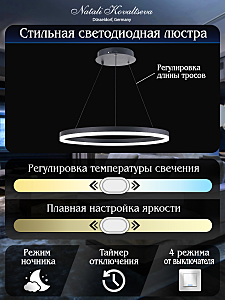 Светодиодный светильник люстра с пультом ДУ, моб приложением для управления со смартфона, планшета. Светильник имеет круглую, кольцеобразную форму с эстетическим дизайном нимб. По периметру располагается контурное свечение, благодаря которому светильник подойдёт в любой интерьер. Высота люстры регулируется, можно настроить нужный наклон нимба. Люстра имеет тёплый, естественный и холодный свет с регулировкой температуры свечения. Обладает плавной настройкой яркости в диапазоне от 10% до 100%. Имеется режим ночника и таймер отключения. От стандартного выключателя люстра имеет 4 режима свечения. Общая мощность 80W со световым потоком 7200 lm позволяет осветить до 15 кв.м. Он прост в сборке, установке и экономичен в обслуживании. Светодиоды легко заменимы в случае перегорания. Люстра подойдёт для всех видов потолков. Цветовая температура настраивается от 3000 до 6500 K. Степень защиты 20 IP.