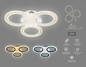 Современный потолочный светодиодный светильник, коллекция ACRYLICA. Модель FA4050 представлена в современном стиле Неоклассика. Светильник выполнен в белом цвете, круглой формы, состоит из 3 акриловых плафонов на металлическом каркасе. Эта модель оснащена встроенными светодиодами, благодаря чему вы забудете о замене дополнительных ламп. Так же с помощью инфракрасного пульта вы сможете регулировать цветовую температуру, яркость освещения и ночной режим. Данная модель подходит для натяжных потолков и будет прекрасным дополнением в любом помещении.