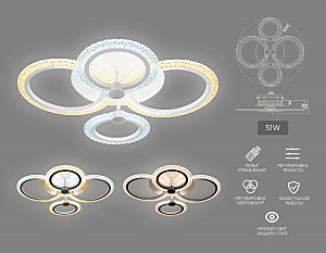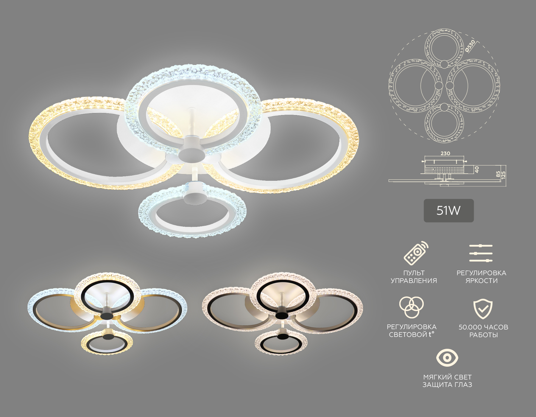 Современный потолочный светодиодный светильник, коллекция ACRYLICA. Модель FA4061 представлена в современном стиле Неоклассика. Светильник выполнен в белом цвете, круглой формы, состоит из 4 акриловых плафонов на металлическом каркасе. Эта модель оснащена встроенными светодиодами, благодаря чему вы забудете о замене дополнительных ламп. Так же с помощью инфракрасного пульта вы сможете регулировать цветовую температуру, яркость освещения и ночной режим. Данная модель подходит для натяжных потолков и будет прекрасным дополнением в любом помещении.