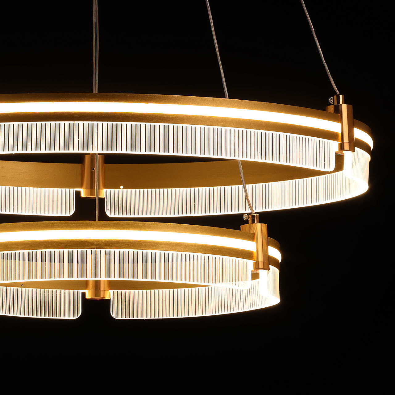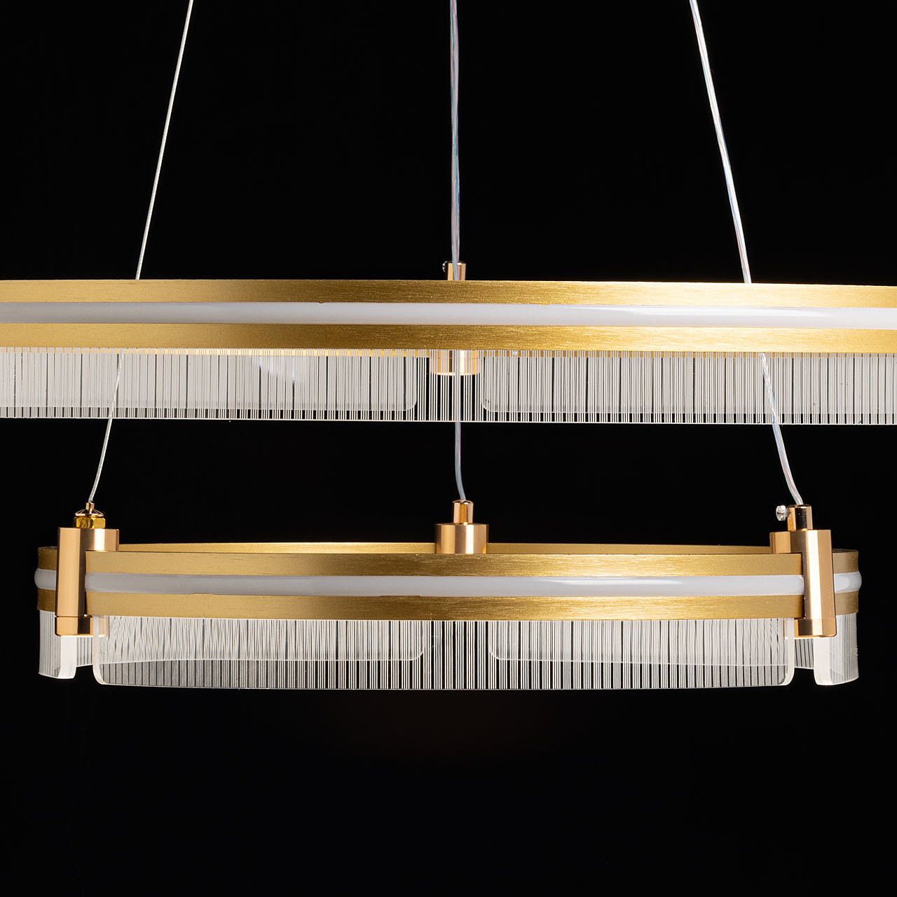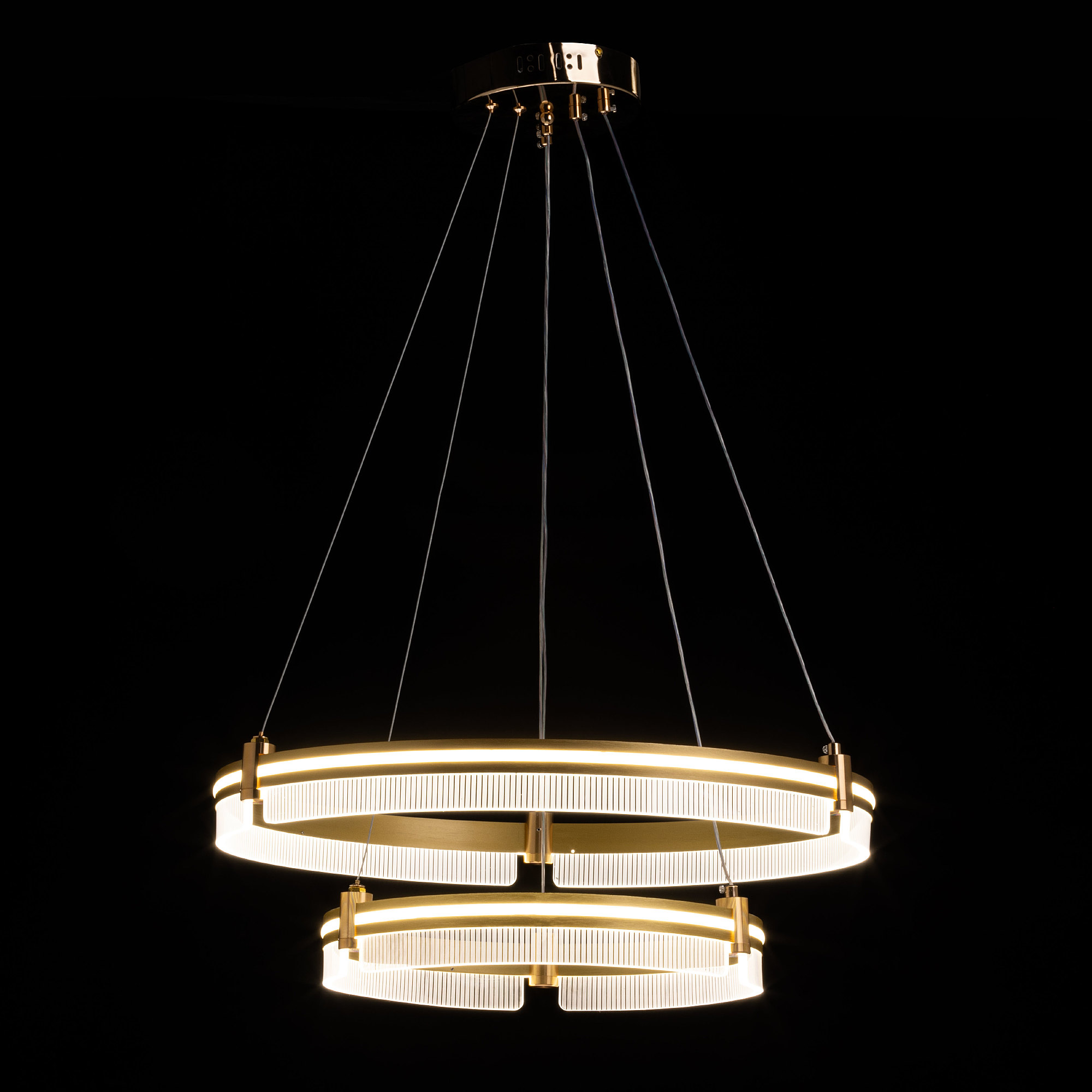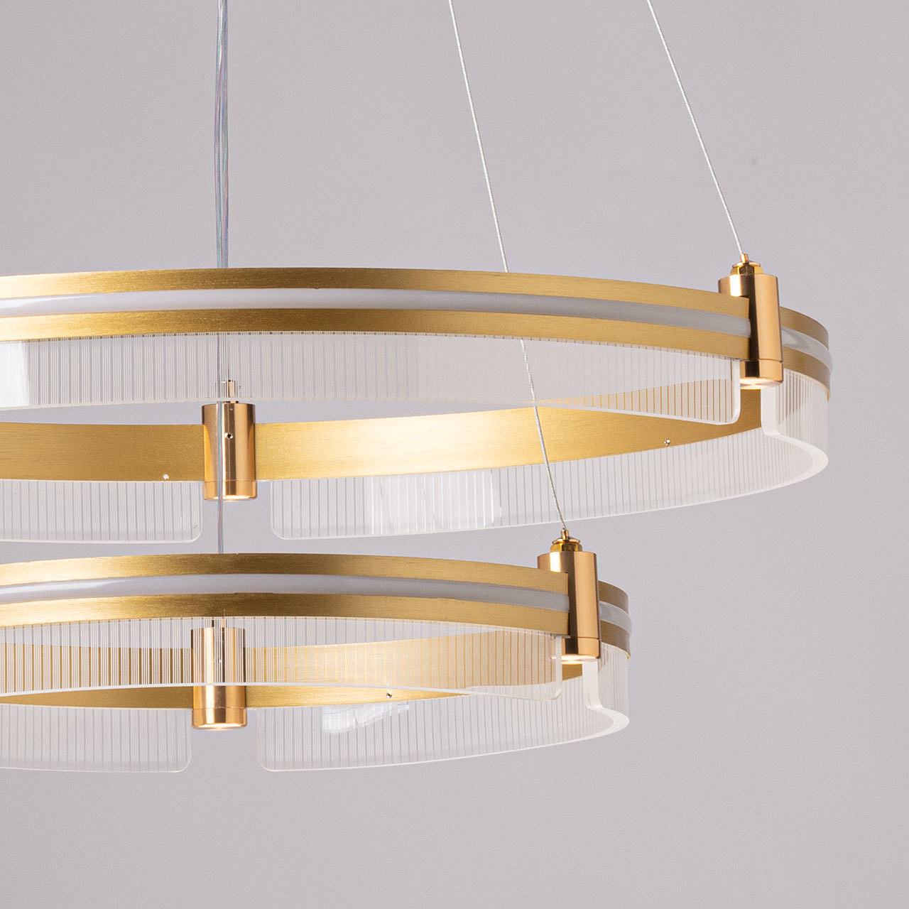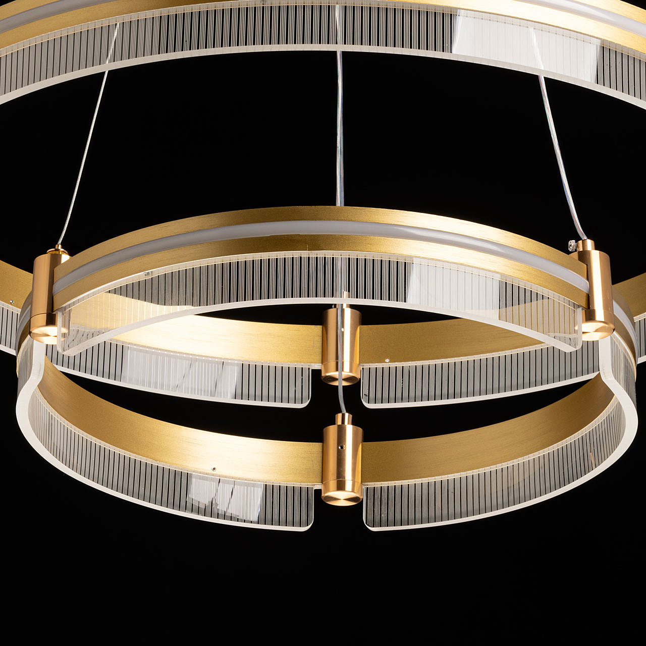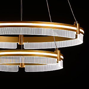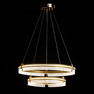 Металлическое основание светильника гальванизировано в цвет золота. Корпус плафона выполнен из сплава алюминия с цинком и обработан по технологии порошкового окрашивания в цвет матового золота. Светодиодные источники света закрыты белым силиконом. Люстра декорирована пластинами из прозрачного акрила с линейным рисунком. -