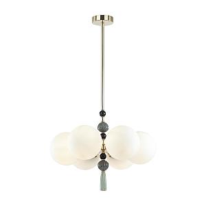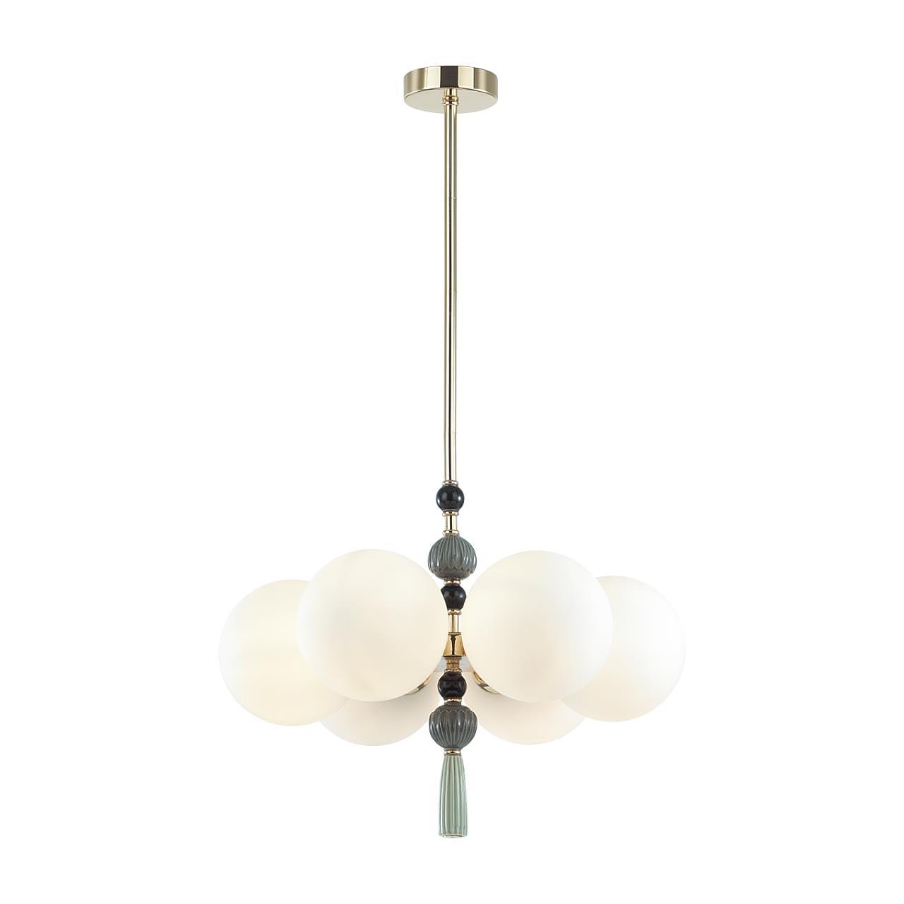 Воздушная линия светильников Palle декорирована керамикой ручной работы. В ней красиво сочетаются гофрированная керамика, металл покрытый золотой гальваникой и матовое белое стекло. Керамический декор выполнен в серых оттенках с акцентной светло-зеленой кисточкой и дополнен стеклянными черными бусинами. Потолочные светильники имеют возможность регулировки высоты благодаря наборной штанге.