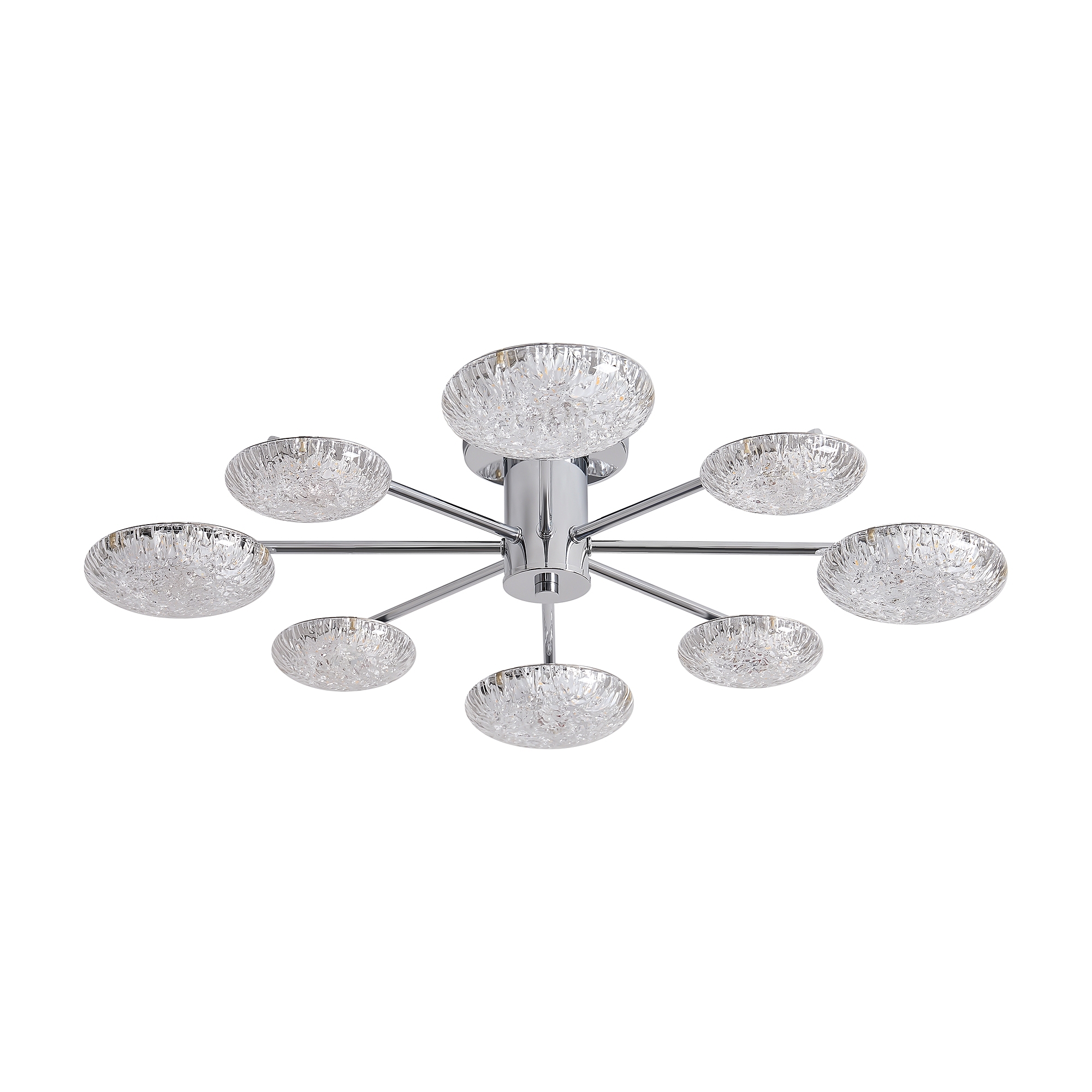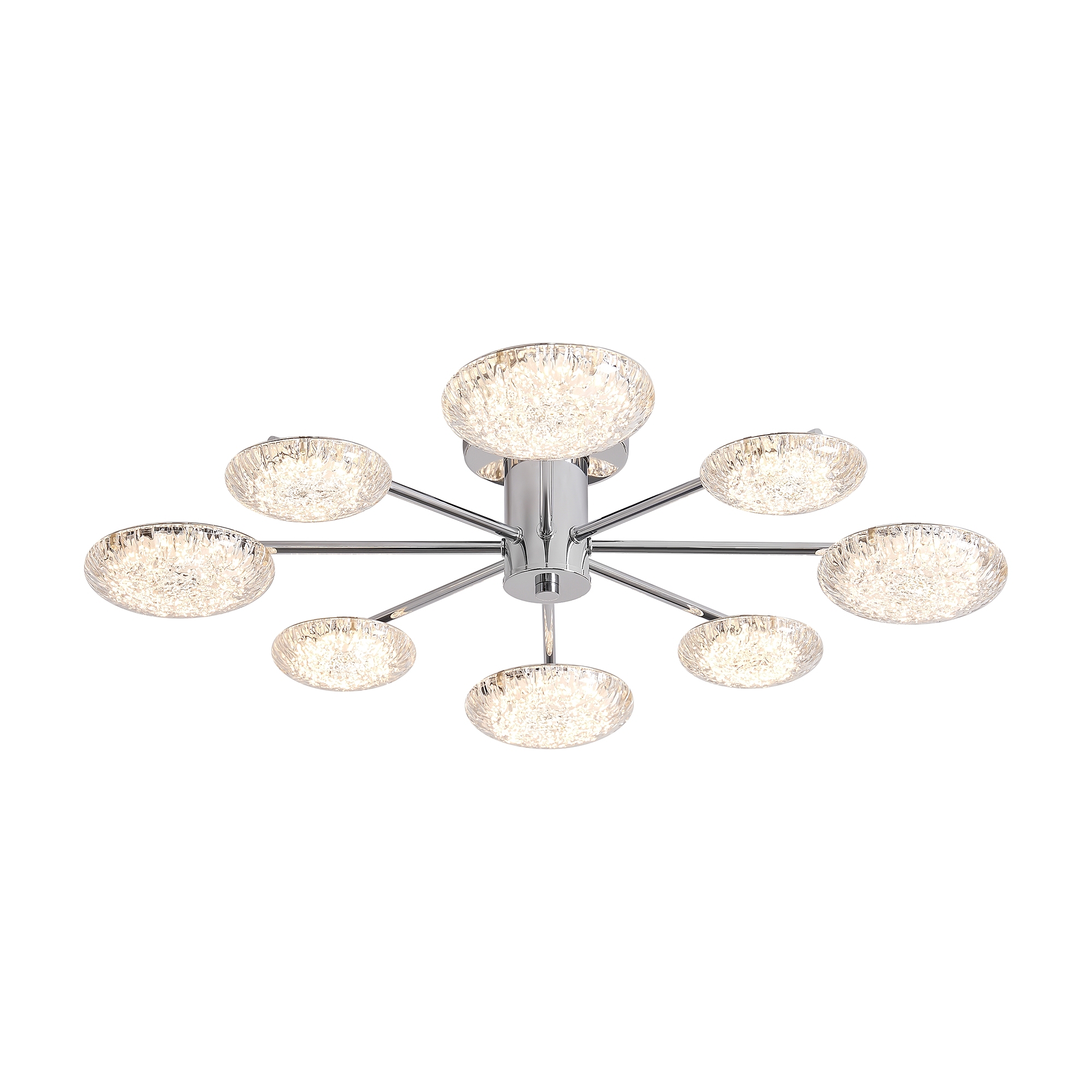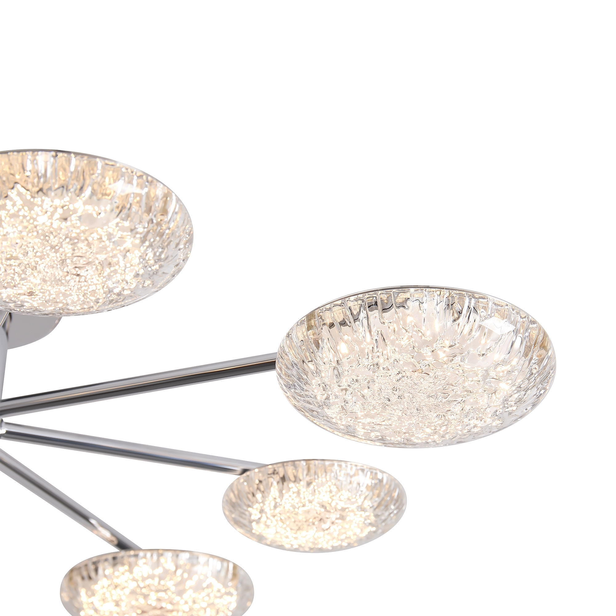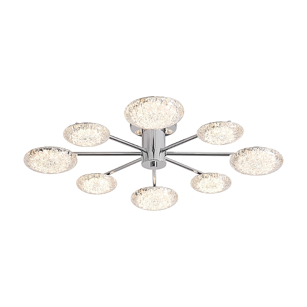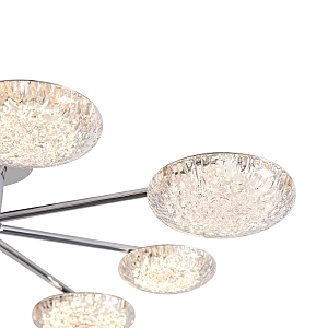 Материал арматуры - металл, цвет - хром. Потолочный светильник оснащен LED-источником света с цветовой температурой 2700К. Плафоны с рисунком из воздушных пузырьков акрила полусферической формы. Футуристичный дизайн идеально дополнит современные интерьеры и помещения с невысокими потолками.