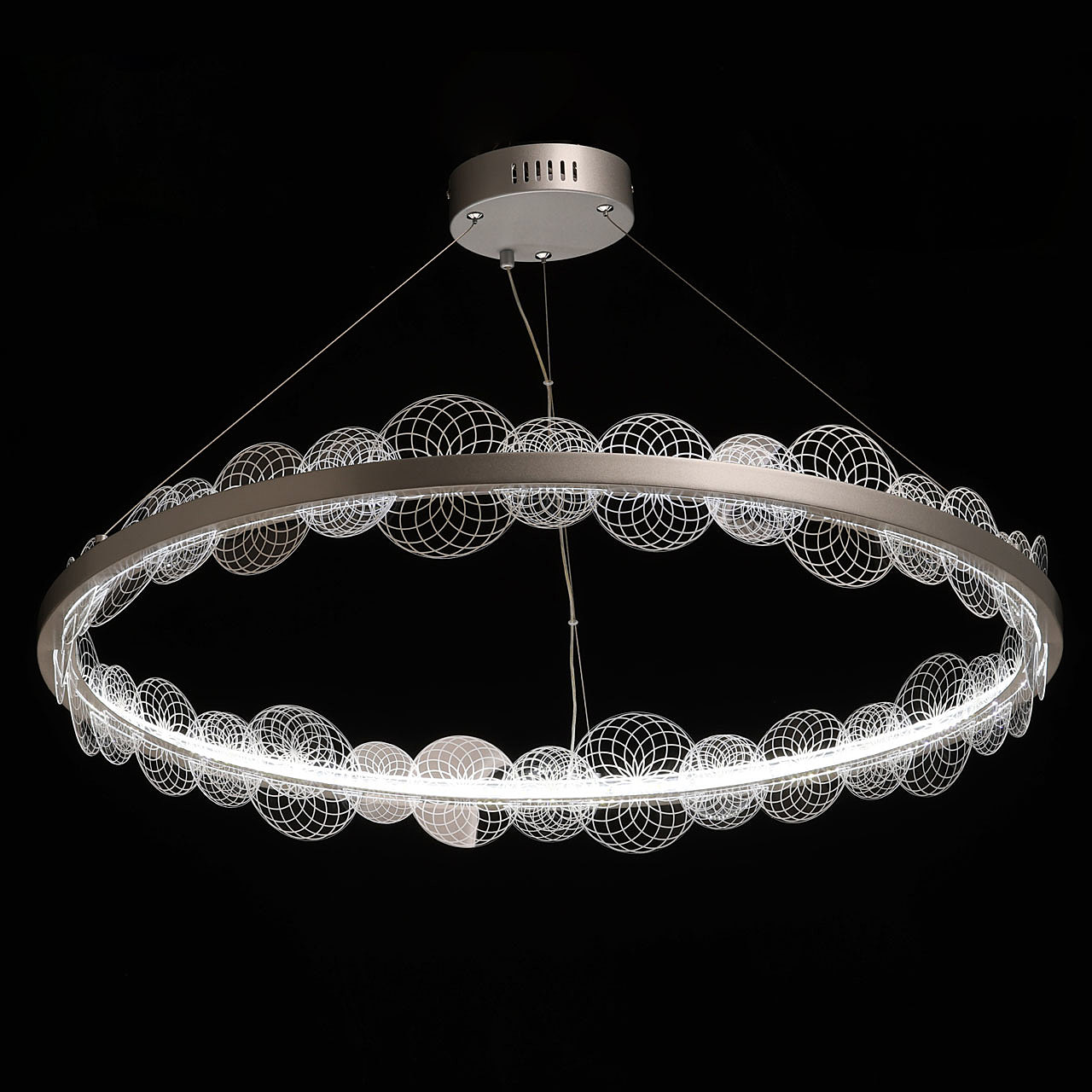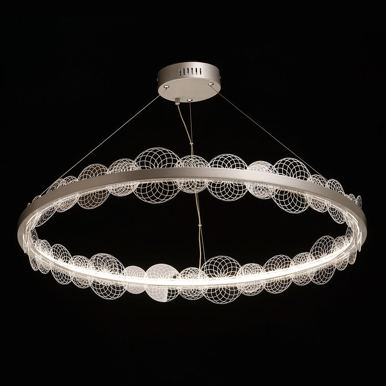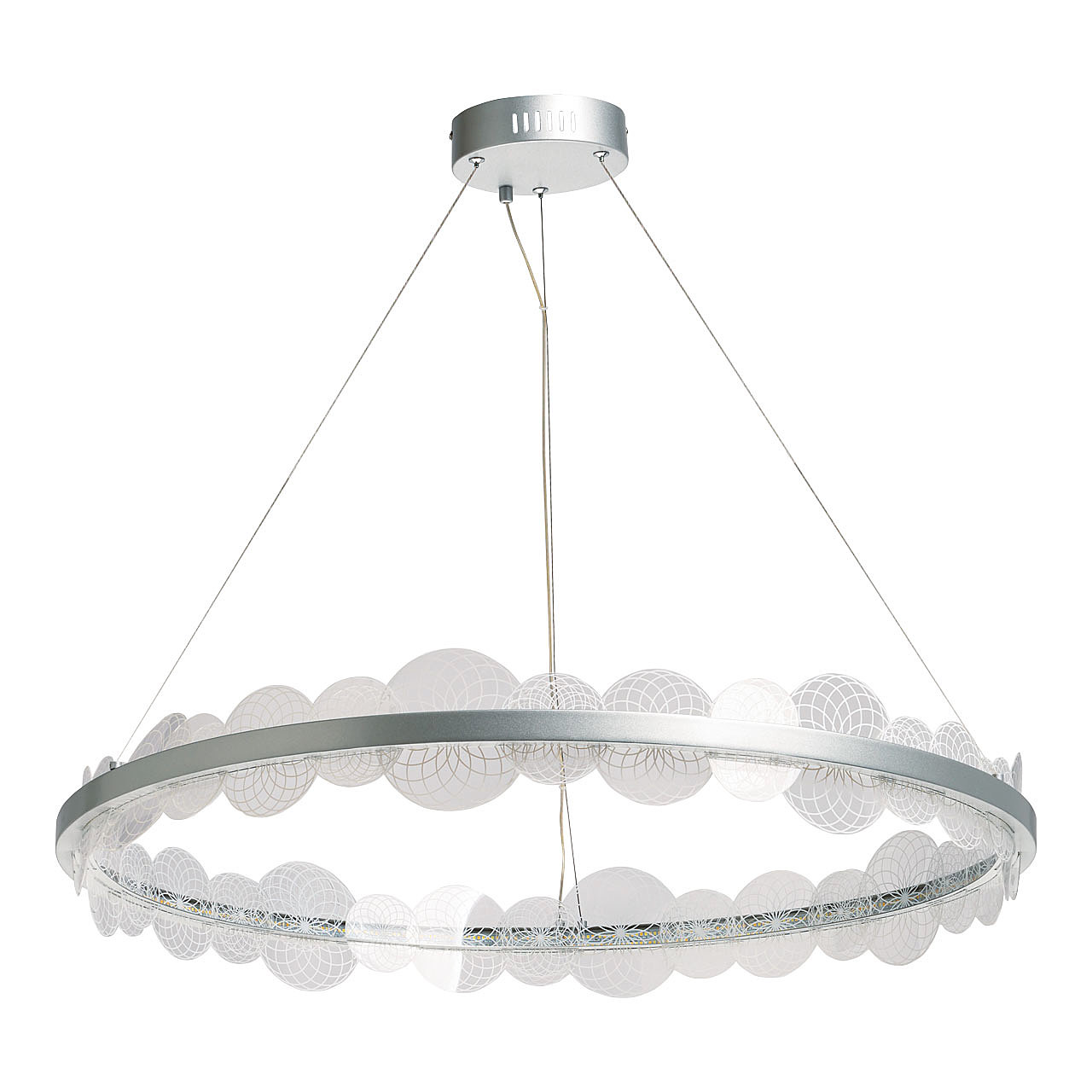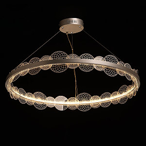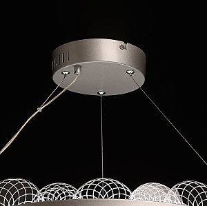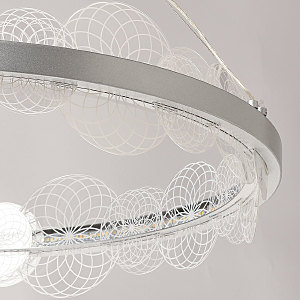 Цвет матового серебра в сочетании с фактурным декором плафона объединяет дизайн подвесной люстры и придает ей индивидуальности. Материал плафона отводит тепло и продлевает срок службы светодиодов. Многорежимность освещения от 3000К до 6500К позволяет подобрать комфортную температуру света. Наличие ПДУ и диммера позволяет установить комфортный режим освещения. Качественные светодиоды экономичны и безопасны.