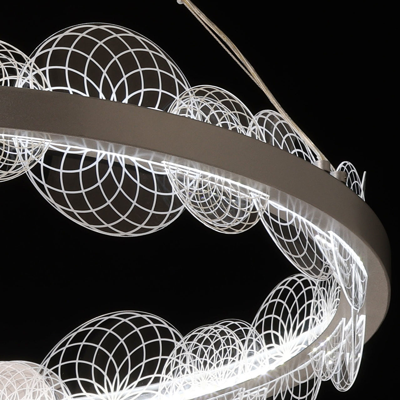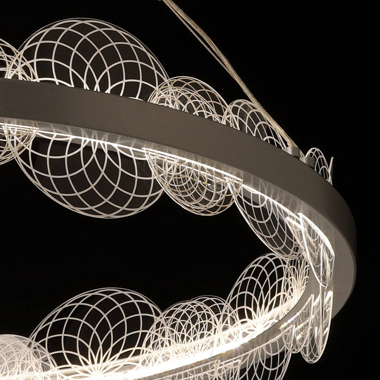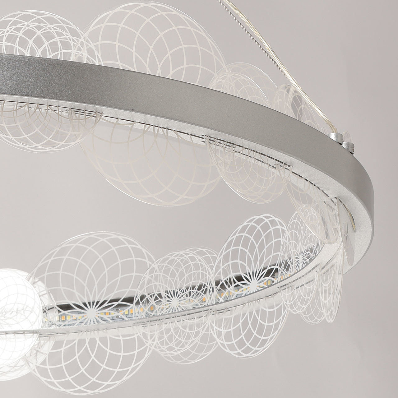 Цвет матового серебра в сочетании с фактурным декором плафона объединяет дизайн подвесной люстры и придает ей индивидуальности. Материал плафона отводит тепло и продлевает срок службы светодиодов. Многорежимность освещения от 3000К до 6500К позволяет подобрать комфортную температуру света. Наличие ПДУ и диммера позволяет установить комфортный режим освещения. Качественные светодиоды экономичны и безопасны.