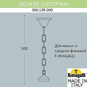 Декоративная цепочка подвес FUMAGALLI, модель SICHEM. Подвес длиной 500 мм для светильника малого и среднего размера. Классический дизайн "под литье", имитация чугунных кованых цепей позапрошлого века. В основании подвеса расположена монтажная петля, и клемма для подключения и проводов электропитания. Монтажная крючок в комплект поставки не входит. На другой стороне подвеса расположено декоративное крепление к крышке фонаря PINNACLES, с помощью которого светильник прочно и герметично соединяется с подвесом. Звенья цепи изготовлены разборными, что позволяет регулировать длину в любую сторону. Для производства используется сверхпрочный технологичный полимерный материал RESIN, который защищает поверхность от агрессивного воздействия всех атмосферных факторов (покрытие не ржавеет, не выгорает на солнце, не боится солей и реагентов). Не проводит электричество!!! Подвес и светильники не требуют заземления и относятся к 2 классу электробезопастности. Посадочный размер для фонарей равен 60мм.. Срок службы - не менее 20 лет. Температура использования от -60 до +90.