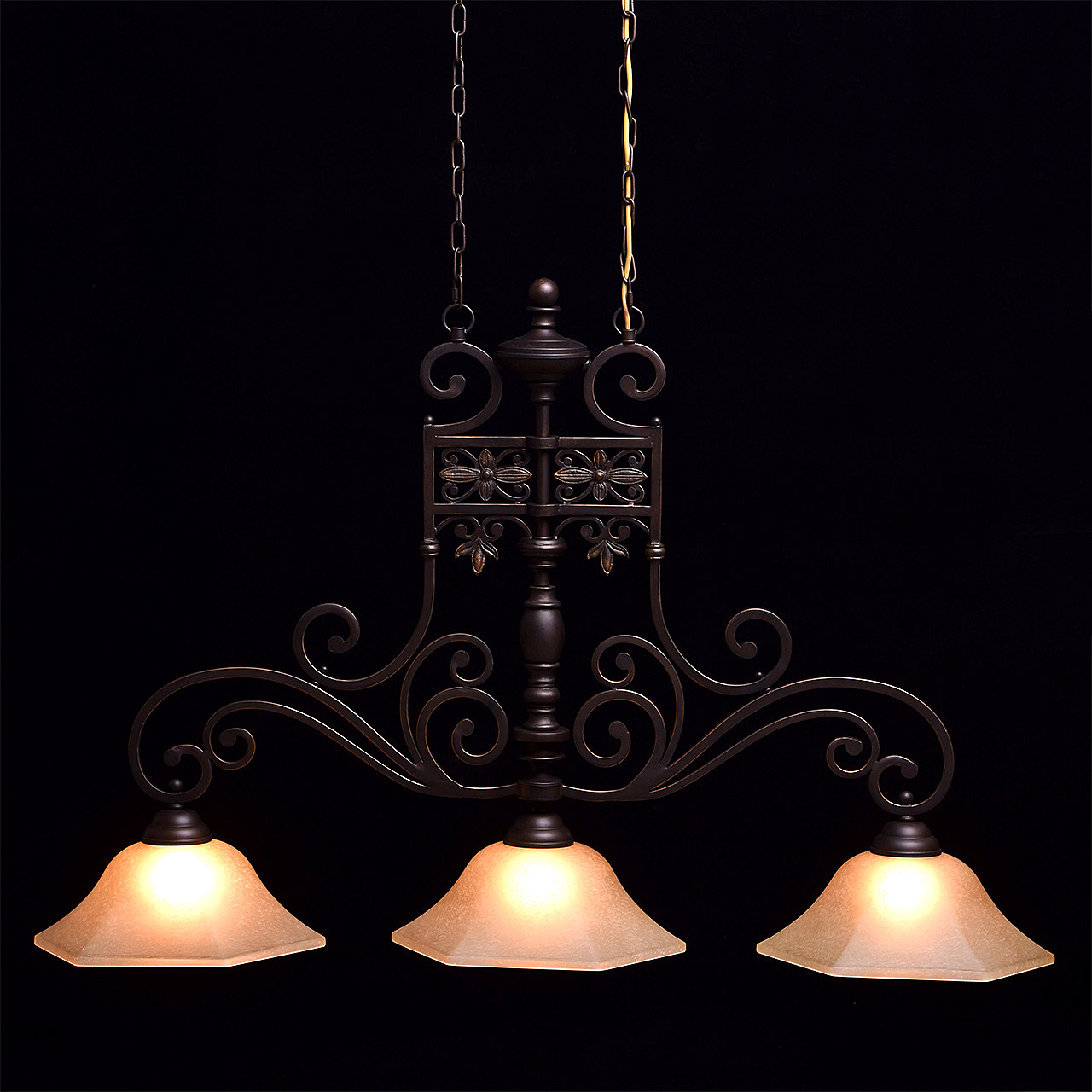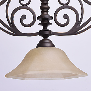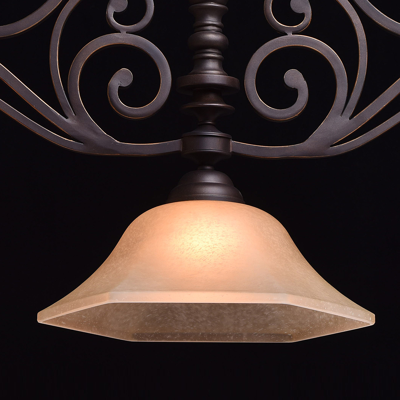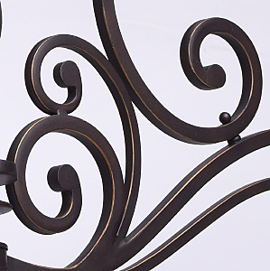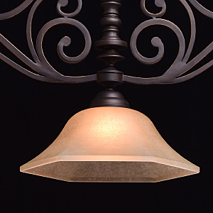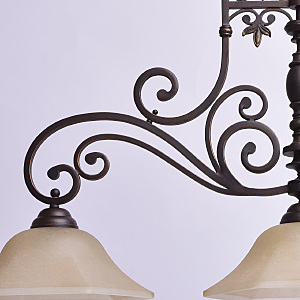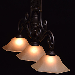 Плавно-изогнутые кованые рожки симметричного каркаса кованого основания светильника Айвенго удерживают в ряд 3 стеклянных плафона, по форме напоминающих раскрывшиеся бутоны соцветий. Матовое фактурное стекло рассеивает свет и создаёт восхитительный эффе