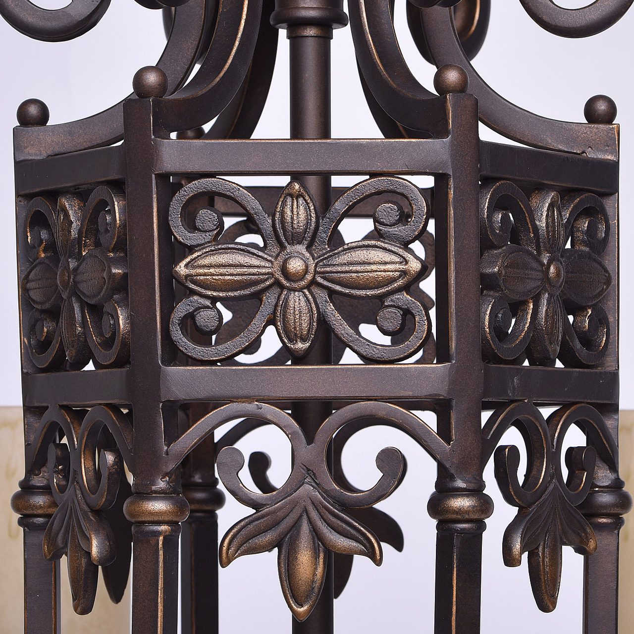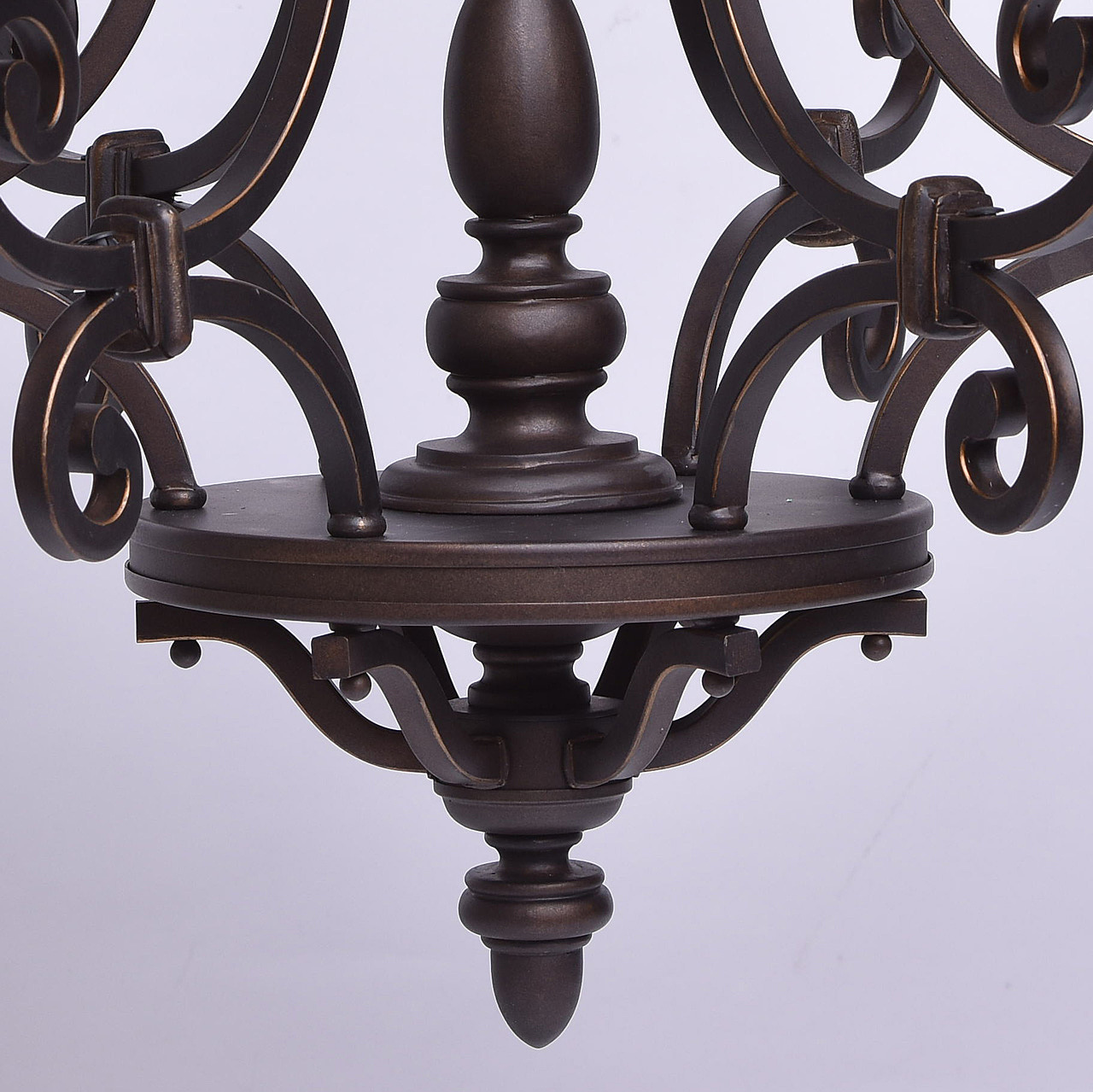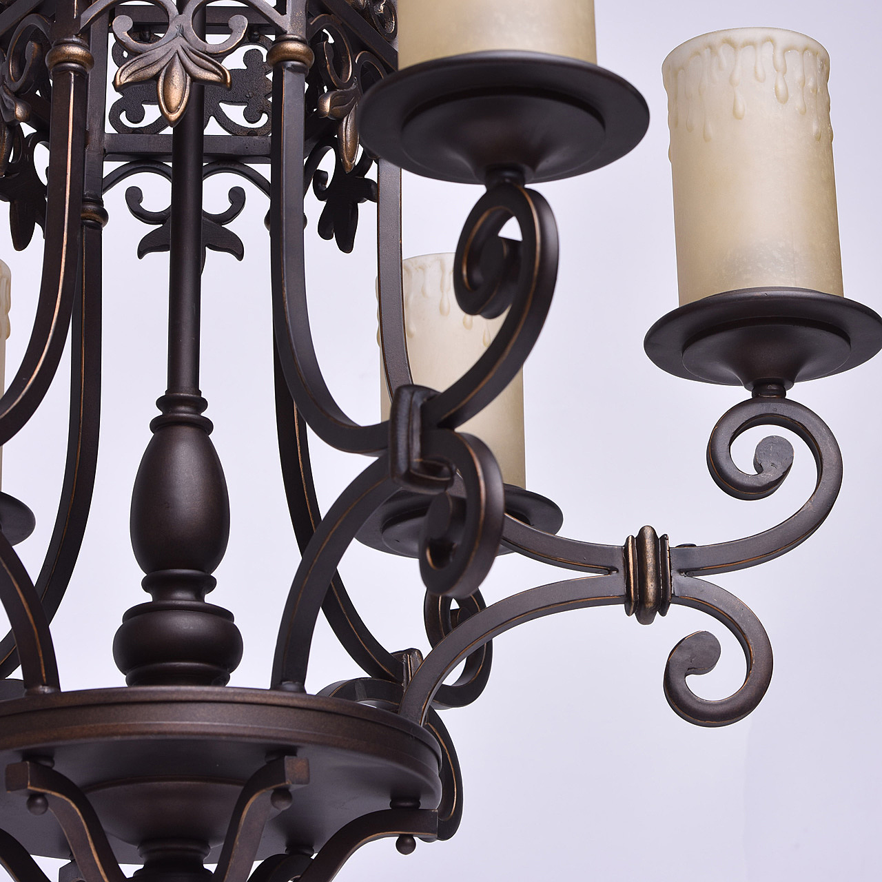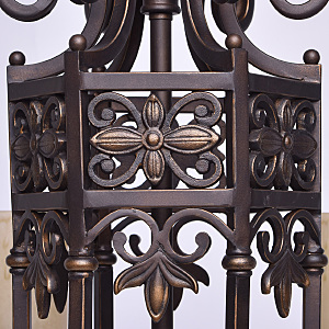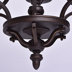 Парадный облик светильника Айвенго формируется благодаря роскошному кованому основанию, окрашенному в цвет состаренного кофе. На металлических витых рожках возвышаются стеклянные плафоны из матового стекла с искусно воссозданным эффектом восковых капель.