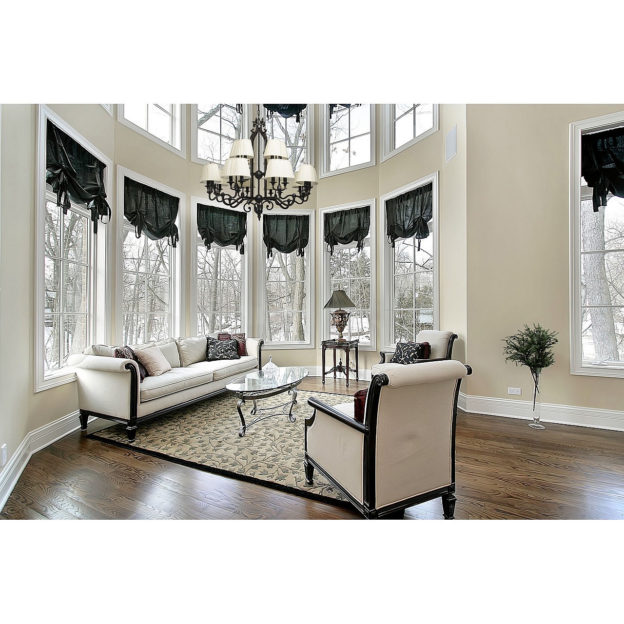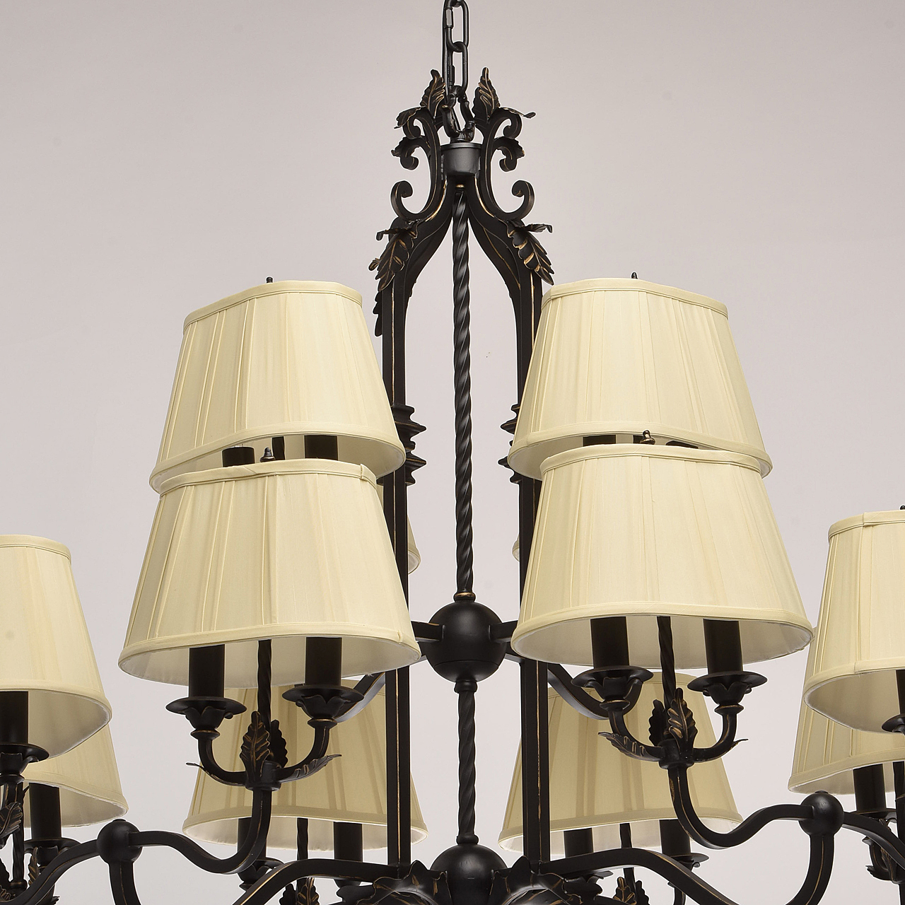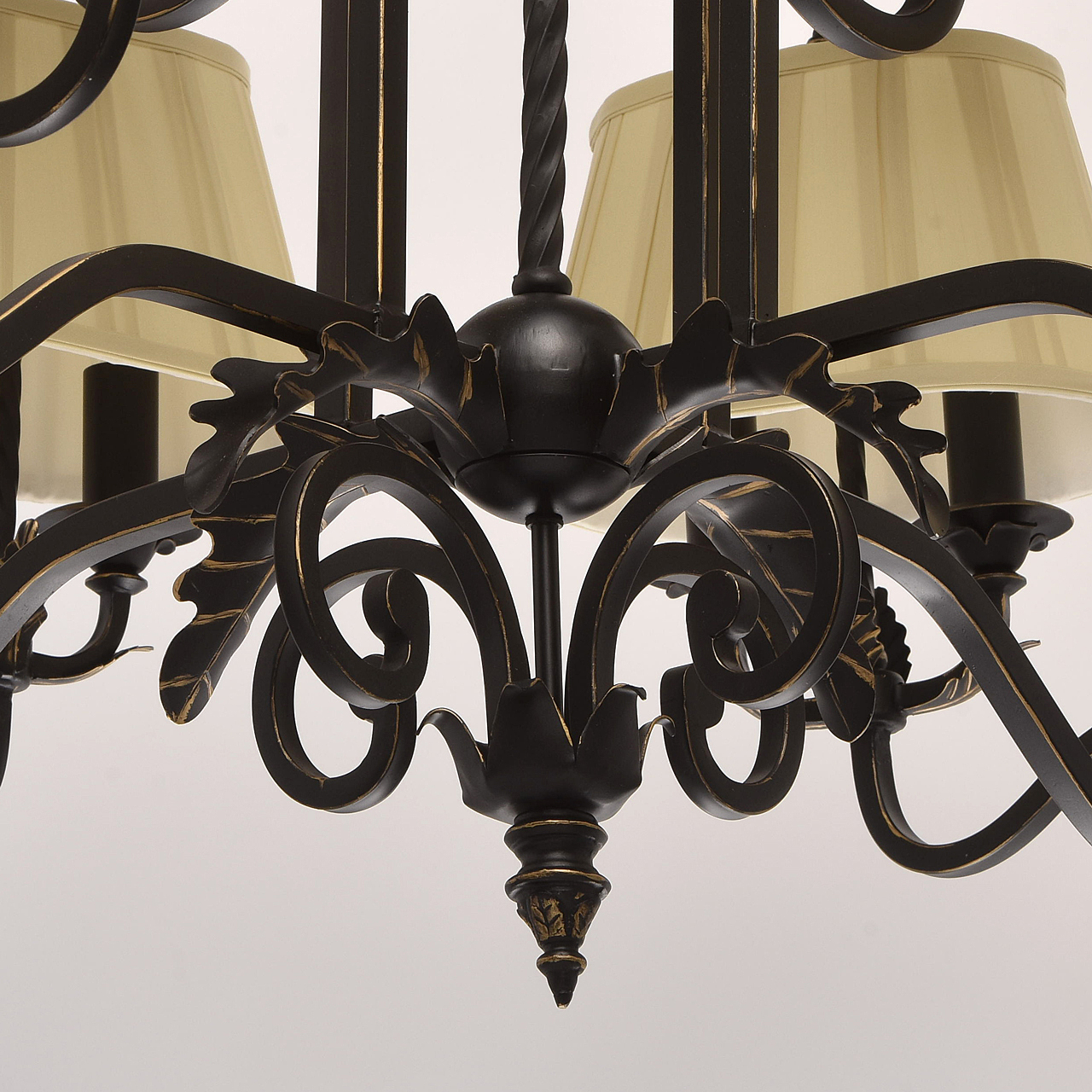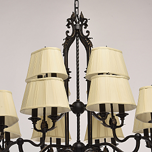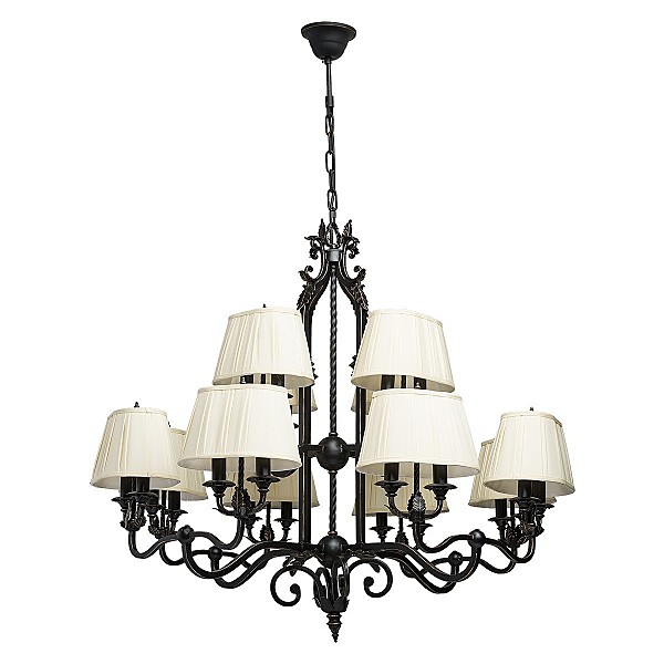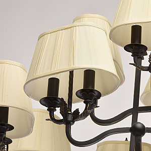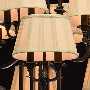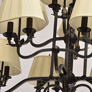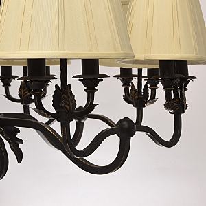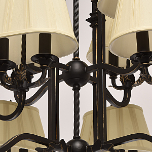 В очертаниях форм светильника Виктория присутствует романская строгость и массивность монументального произведения. Это ощущение достигается благодаря матово-чёрному кованому основанию, выполненному из качественного металла. Арматура изготовлена по сложны
