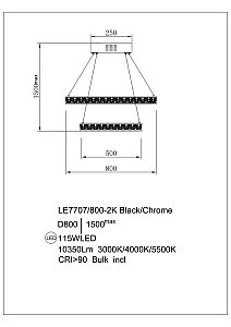 Допускается отличие страны-изготовителя, указанной в характеристиках. Линии производства могут находиться в нескольких государствах. Это не влияет на качество изготовления товара: все заводы данного бренда работают по общим стандартам, а готовые изделия проходят соответствующий контроль.Россия Коллекция Aida ЦветЦвет арматуры черный хром Цвет Хром Материал арматуры Металл гальванизированный Цвет плафона прозрачный Материал плафона Хрусталь РазмерыВысота (мм) 1500 Длина (мм) 90 Диаметр (мм) 800 ЭлектрикаЦоколь LED Мощность лампы (Вт) 115 Световой поток 10350 Цветовая температура холодный (5500k) Дополнительная информацияВес (Кг) 6.3 -