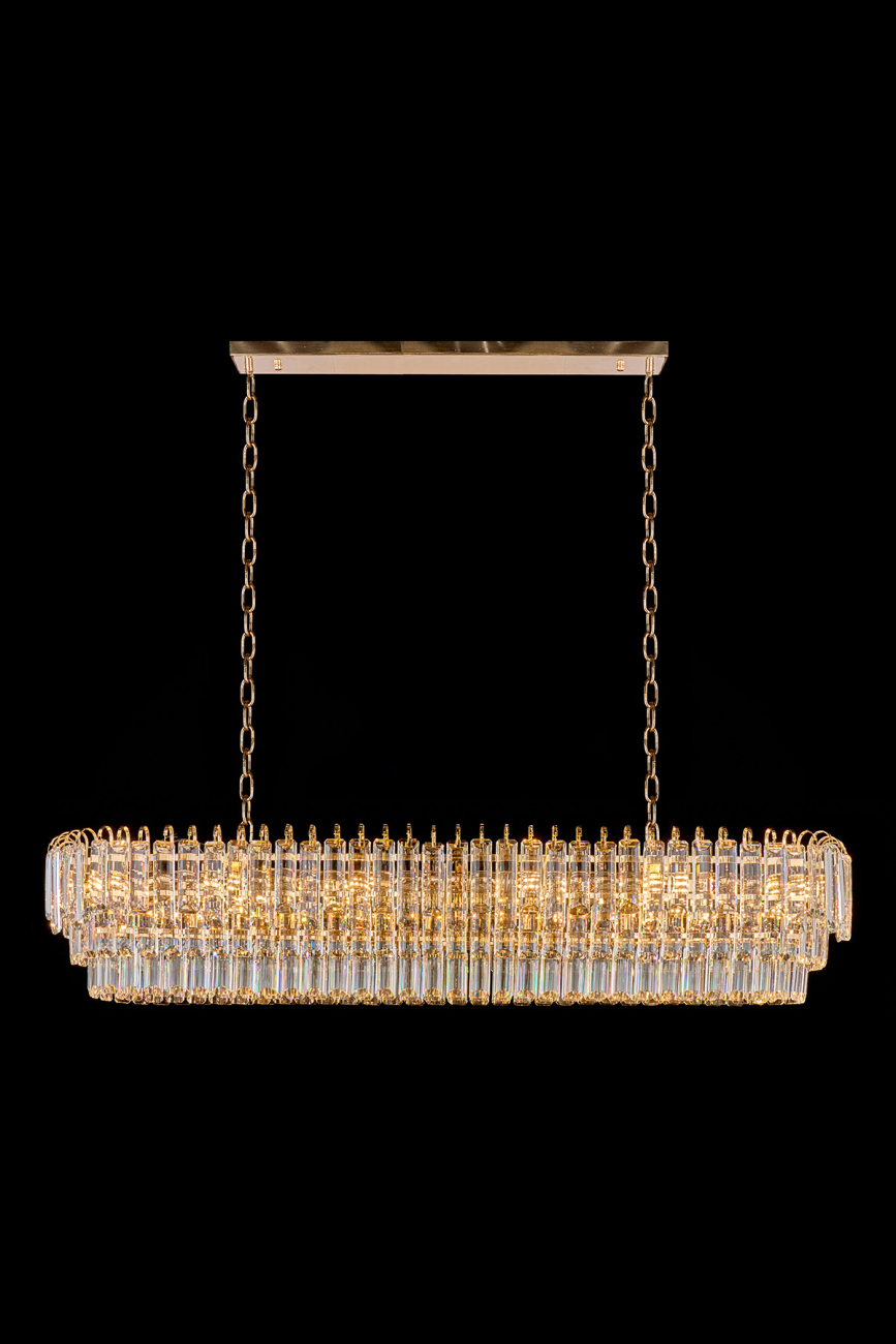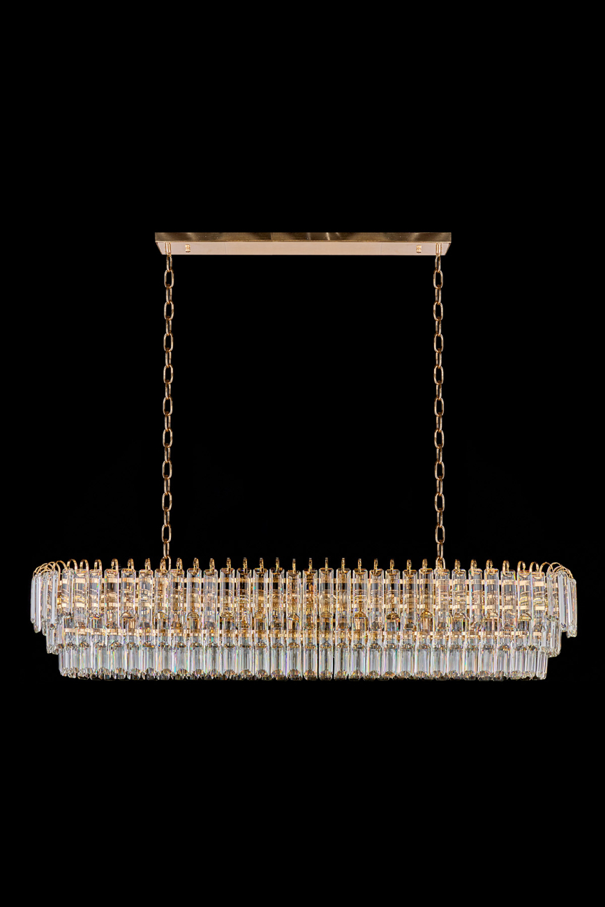 Допускается отличие страны-изготовителя, указанной в характеристиках. Линии производства могут находиться в нескольких государствах. Это не влияет на качество изготовления товара: все заводы данного бренда работают по общим стандартам, а готовые изделия проходят соответствующий контроль.Россия Коллекция Catherine ЦветЦвет арматуры Золото Цвет Золото Материал арматуры Металл гальванизированный Цвет плафона прозрачный Материал плафона Хрусталь РазмерыВысота (мм) 1440 Длина (мм) 120 Ширина (мм) 300 ЭлектрикаКоличество ламп (шт) 21 Цоколь E14 Дополнительная информацияВес (Кг) 7; 5 15 -