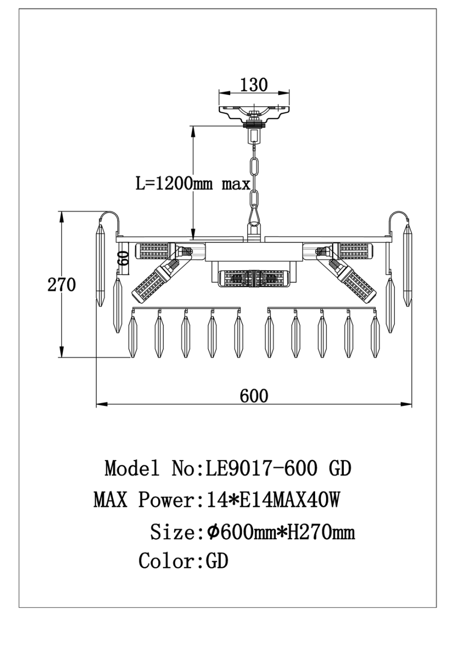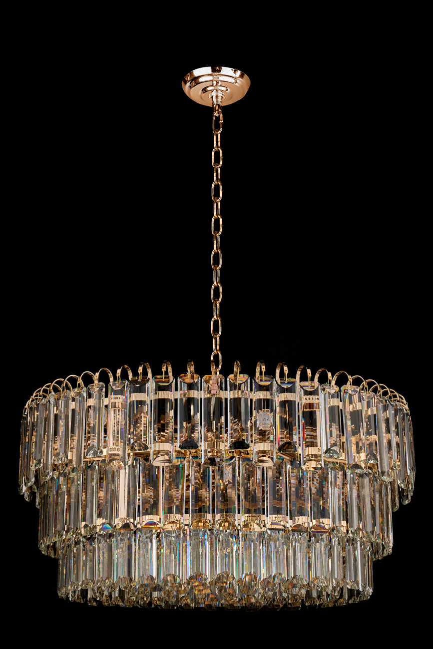 Допускается отличие страны-изготовителя, указанной в характеристиках. Линии производства могут находиться в нескольких государствах. Это не влияет на качество изготовления товара: все заводы данного бренда работают по общим стандартам, а готовые изделия проходят соответствующий контроль.Россия Коллекция Catherine ЦветЦвет арматуры Золото Цвет Золото Материал арматуры Металл гальванизированный Цвет плафона прозрачный Материал плафона Хрусталь РазмерыВысота (мм) 1470 Длина (мм) 61 Диаметр (мм) 600 ЭлектрикаКоличество ламп (шт) 14 Цоколь E14 Дополнительная информацияВес (Кг) 4; 3 12 -