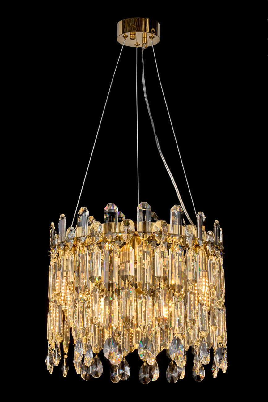 Допускается отличие страны-изготовителя, указанной в характеристиках. Линии производства могут находиться в нескольких государствах. Это не влияет на качество изготовления товара: все заводы данного бренда работают по общим стандартам, а готовые изделия проходят соответствующий контроль.Россия Коллекция Elien ЦветЦвет арматуры Золото Цвет Золото Материал арматуры Металл гальванизированный Цвет плафона прозрачный Материал плафона Хрусталь РазмерыВысота (мм) 1515 Длина (мм) 45 Диаметр (мм) 400 ЭлектрикаКоличество ламп (шт) 6 Цоколь E14 Дополнительная информацияВес (Кг) 9.2 -